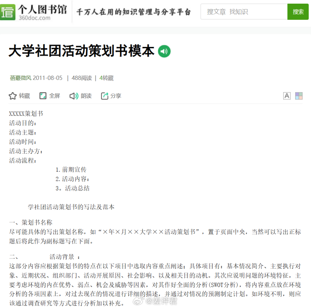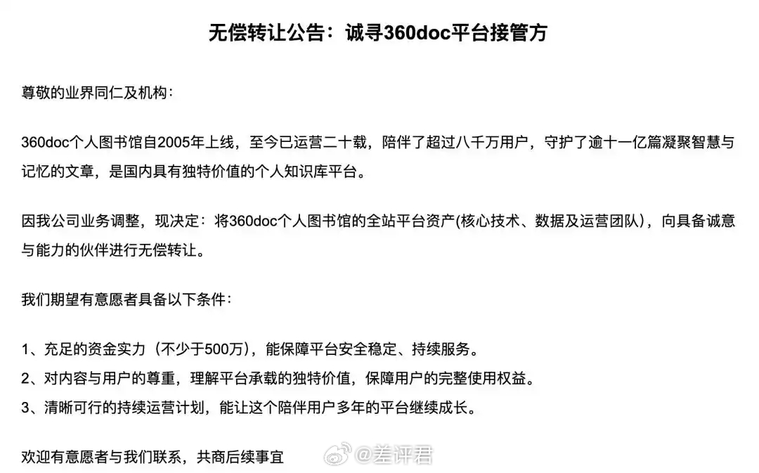 #拯救无数学生的文库网站正在消失# 前几天刷到条新闻,有点唏嘘。2005年就上线的古早网站360doc要无了。学生时代,总会需要写一两份活动策划、述职报告、申请书等等,上网搜一份模板,改一改交作业。于是,你就丝滑进入到了360doc 。。。就算你没有用过360doc ,应该也用过百度文库、道客巴巴、豆丁网等等。只是,这个在20年前诞生,一度大放异彩的模式,在当下已经抵达拐点,也可能是终点。其实360doc的核心功能是“网络摘录本” ,本质是个网页文章收藏工具 + 阅读社区。360doc也称自己是大家的个人图书馆、网络知识管理库。商业模式也非常简单,用免费来吸引用户使用,网站再卖广告位。在2016年营收能有2600多万,毛利率也挺可观。与此同时,互联网上的文档需求急速上升,学生要题库课件,打工人要策划模版范本,行业人要行业资料。在各大BBS、社交网站中,这几乎是教科书级别的副业项目。用户上传文档就可以享受分成,下载文档则需要付费。无数人把电脑里压箱底的文档一股脑倒了进来。文库网站的资料丰富到离谱,也丰富到有点危险。更准确来说,所有文库产品都绕不开版权的坎,侵权官司不断。更让文库头疼的,是泄密。文库里流通了很多文件,里面就可能带着技术参数跟图纸。同时随着行业竞争越来越猛,背靠搜索入口的“富二代”百度文库,占了流量资源的天然优势。而现在更强大的工具AI它来了。360doc宣布无偿转让的时候,创始人蔡智其实说的很直白,受AI的浪潮影响,原有的团队已无力为它提供走向下一个二十年所需的庞大资源。新的方式涌现,成为新贵,老旧的方式被迫告别,成为回忆。时代本身就是一辆列车,能留下来的可能远比我们想象中的要少。