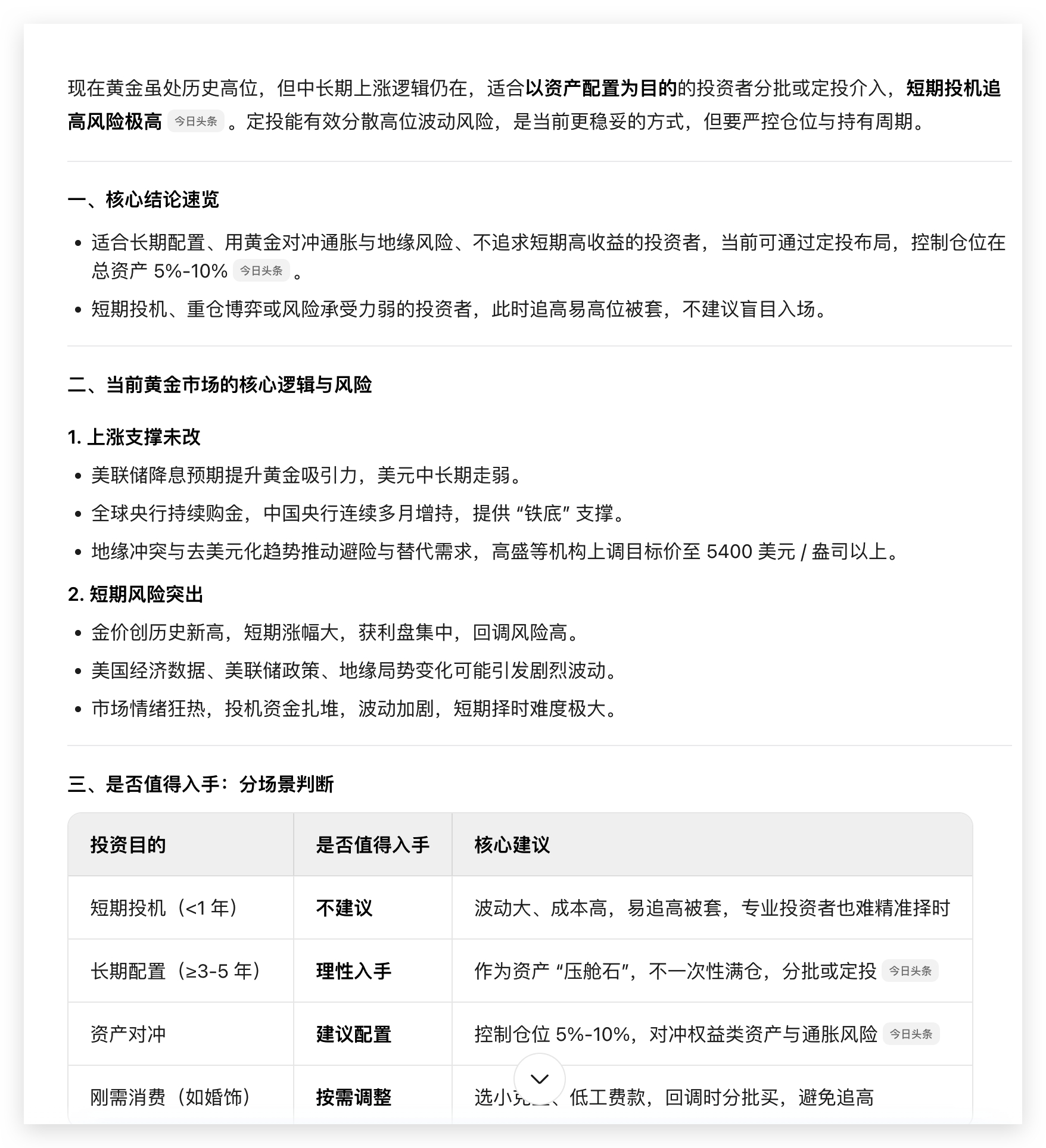 黄金暴跌黄金从昨晚到今天来回震荡,昨天刚入手的朋友现在心情应该很纠结吧,我也问了一下GPT豆包和DeepSeek,现在的金价还是否值得投资,基本上都是长期看好,但短期真的不建议跟风今日金价