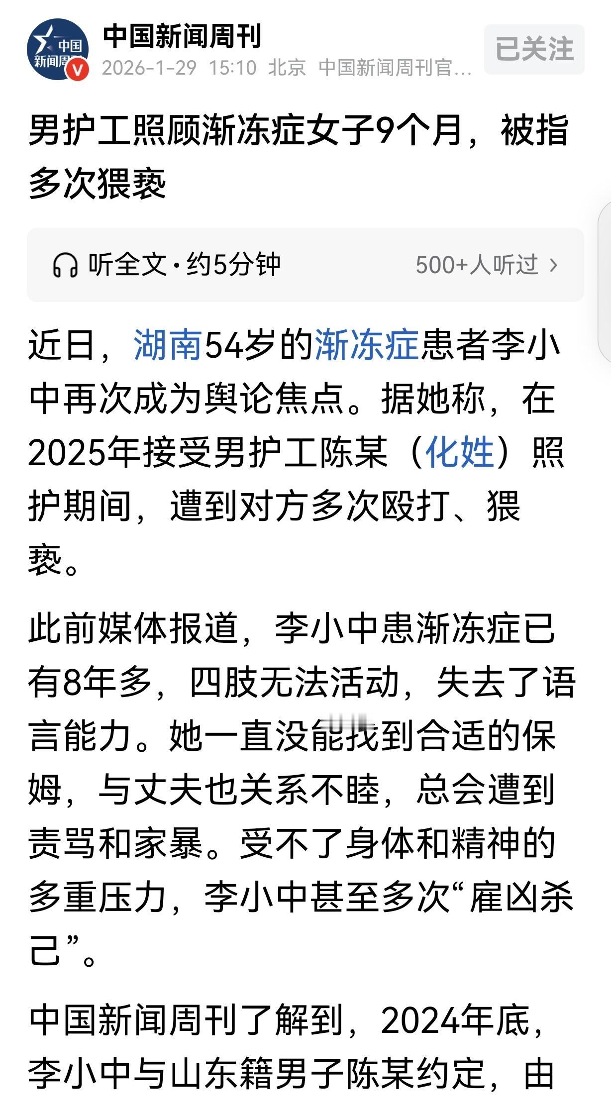 湖南,一54岁女子是渐冻症患者,她花4000元,雇了个男护工照顾自己9个月,不料,男护工竟然多次殴打非礼女子,她不想起诉男护工,只要求他跟自己道歉,不料,男护工说道歉不可能,女子怒了,直接报了警,让法律制裁他。 2019年,一场意外摔伤后,她的身体就像被按下了暂停键,慢慢失去了所有活动能力。 她的丈夫常年在外跑货运,一年到头也回不了几次家,两人聚少离多,见面就吵,偶尔丈夫回家,带给她的也不是照料,而是责骂和殴打。 女儿女婿虽有心想接她回家,却始终没能落实,她也曾找过保姆,可没相处多久就闹了矛盾,最后只能独自面对漫长又痛苦的日子。 长期的身体折磨和精神煎熬,让李小中不止一次想过放弃,她甚至动过“雇凶杀己”的念头。 可每次都没能成功,只能在绝望中苦苦挣扎,盼着能有一个靠谱的人,陪自己熬过这段艰难的时光。 这时,她想到了陈某,两人十年前在北京开店时就认识,当时陈某就曾向她表达过好感,只是那时李小中没有同意。 如今走投无路,李小中主动联系了陈某,而陈某也再次提出,想和她结婚,还承诺会好好照顾她。 李小中没有立刻答应,她先是把陈某叫到湖南,试用考察了一个月,确认对方还算细心后,才和他达成了约定。 自己每个月支付4000元工资,陈某负责全方位照顾她的起居,若是一年里陈某照护得当,她就考虑和丈夫离婚,再和陈某结婚。 她不知道的是,陈某的“真心照料”,从来都不是因为好感,而是打着自己的小算盘,他想通过和李小中结婚,合并户口申请双人低保,每个月能多拿两千多块钱补贴。 2024年12月,李小中跟着陈某来到了山东济南平阴县的家中,谁也没想到,这一去,就陷入了无法脱身的困境。 刚到山东的那段时间,陈某还装得十分细心,可没过多久,他的耐心就慢慢耗尽了。 2025年1月初,李小中还只是觉得陈某有些固执,可到了1月下旬,陈某就露出了真面目。 一次,李小中想翻身到右边,陈某却不顾她的反抗,强行把她翻到左边,力道大得让她喘不上气,甚至还动手打了她。 李小中急得浑身发抖,却连呼救都做不到,只能靠着眼控设备,一点点打字控诉,可这份微弱的反抗,在陈某眼里,根本不值一提。 陈某事后也曾道歉,承诺再也不会动手,可这份承诺,仅仅维持了几天就失效了。 随着相处时间越来越长,陈某的态度越来越差,照护动作变得十分粗鲁,辱骂更是家常便饭。 到了3月,李小中察觉到陈某的真实目的,明确表示不会和他结婚后,陈某彻底变了脸,甚至会故意把她的脚按进滚烫的热水里,看着她痛苦挣扎,却无动于衷。 李小中曾想过逃离,她想让女儿女婿接自己回湖南,可一想到回家后依旧无人妥善照料,再加上陈某一边流泪挽留,一边承诺会改正,心软的她,最终还是选择了留下。 她的妥协,不仅没有换来陈某的收敛,反而让对方更加肆无忌惮,从2025年4月开始,陈某的恶行升级了,他开始趁着照护的间隙,对李小中做出不当肢体接触。 客厅里、卫生间的监控死角里,都留下了他作恶的痕迹,他会隔着衣服触碰李小中的隐私部位,甚至强行凑近亲吻她。 李小中拼尽全力反抗,她拼命扭过头躲避,用尽全身力气发出微弱的哼鸣,可她连抬手推开对方的力气都没有,只能眼睁睁看着伤害发生。 她知道,陈某之所以敢如此肆无忌惮,就是拿捏了她无法自主行动、求助无门的困境,也笃定她不敢声张。 为了记录下这些伤害,李小中只能趁着陈某不注意,靠着眼控设备慢慢打字,一点点留存证据,她还偷偷把监控视频备份,生怕这些唯一能证明自己遭遇的痕迹,被陈某删除。 后来,李小中实在无法忍受这种身心双重的折磨,她主动找陈某沟通,没有提起诉讼的事,只是卑微地要求他能认个错、道个歉,从此好聚好散。 可让她没想到的是,陈某不仅没有丝毫愧疚,反而态度嚣张,直言道歉是不可能的,甚至还嘲讽她无依无靠,就算说了也没人信。 于是她开始偷偷联系自己的好友张女士,趁着陈某不注意,把备份的监控视频、眼控设备记录的文字,一点点发给对方,拜托好友帮自己寻求帮助。 2025年8月底,趁着天气转热、自己呼吸不畅需要更换环境的契机,李小中在好友的帮助下,终于逃离了陈某在山东的家,辗转来到了开封一家养老院,暂时摆脱了陈某的控制。 在好友的陪同下,把所有留存的证据都提交给了民警,详细讲述了自己这九个月来遭遇的所有伤害。 民警接到报案后,立刻介入调查,查看了监控视频和相关记录,确认情况属实后,很快就受理了案件,并出具了受案回执,正式立案侦查。 如今,案件还在进一步调查中,我们也期待着警方能尽快给出调查结果,还她一个公道,也希望每一个像李小中一样的失能者,都能被世界温柔以待,都能拥有反抗伤害的勇气和底气。