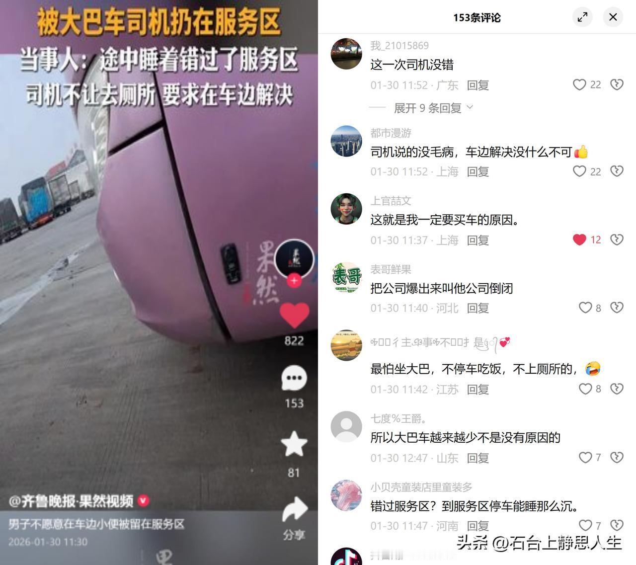 错过服务区内急,被司机扔在半路 男子坐长途大巴睡过了服务区,内急想上厕所被司机要求在车边解决,拒绝后直接被甩在服务区。这事在网上吵翻,有人站司机说实用主义没毛病,有人吐槽大巴行业乱象。 这并不单纯是谁对谁错的问题,根源在于长途大巴行业里重效率轻权益的潜规则在作祟。司机要赶时间,怕耽误路程影响排班或被扣钱,宁可踩规则红线,不管在哪,这种要求要么违法要么违规,也不愿多花几分钟满足乘客的基本需求。 至于说男人路边尿没所谓的,本质是对隐私的漠视。成年人的体面,不该因为坐了大巴就打折扣。现在大巴越来越少不是没原因的,当服务只盯着时刻表,把乘客当赶路的货物,谁还愿意买账?你遇过这种糟心事吗?