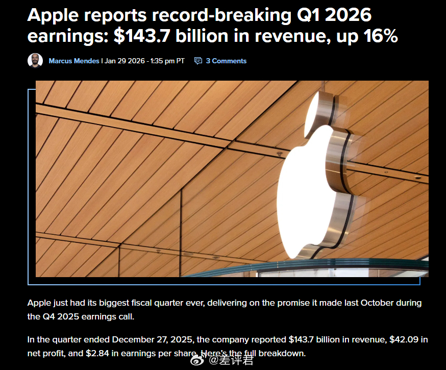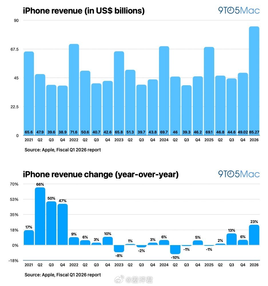 #差评说数码# 苹果发了个 2026 财年 Q1 的财报,总营收 1437 亿美元,创下了历史单季度最佳,其中主要还是 iPhone,营收了 852.7 亿美元。说白了只要苹果迭代提升幅度大一点,就能卖得嘎嘎好,但是根据爆料 iPhone 18 标准版可能会延后发布。。。难道说又要挤牙膏了?