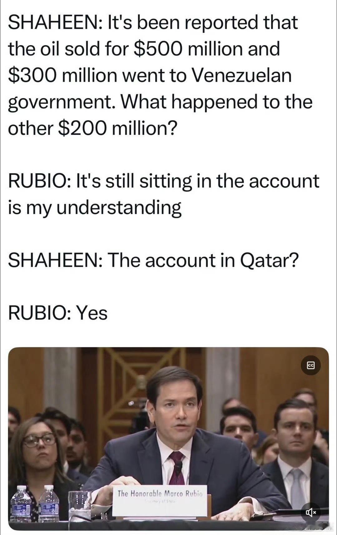 美国到底从委内瑞拉的石油中挣到了多少钱?鲁飙在昨晚亲口说,从抓捕马杜罗到现在,委内瑞拉共卖了五亿美元石油,三亿交给委内瑞拉政府,两亿存入美国政府在卡塔尔的账户里。 从事实上说,美国已经取消了对委内瑞拉的制裁