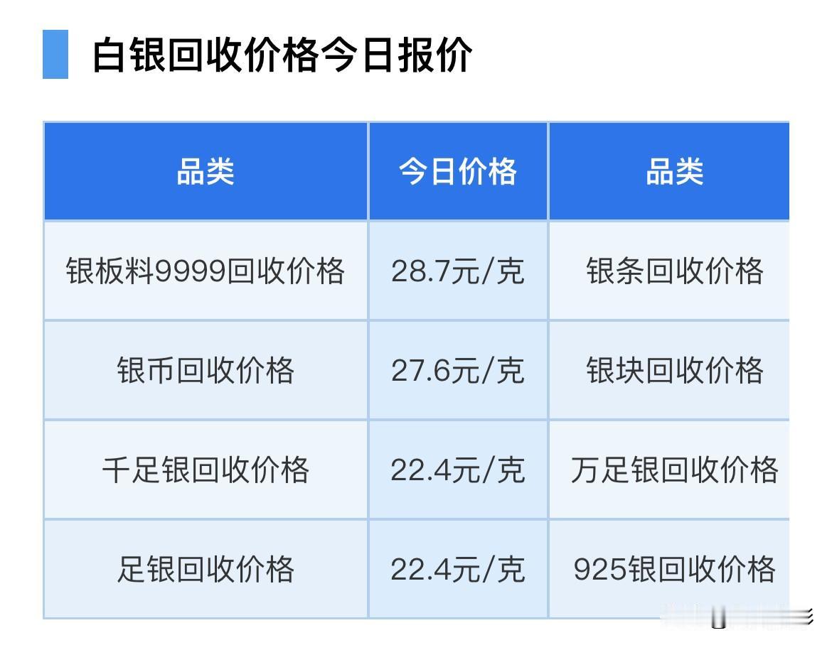 今日银价!下跌了! 那么,来看看,现在白银回收报价是多少钱一克了? 银板料9999回收价格28.7元/克,银条回收价格27.6元/克,银币回收价格27.6元/克,银块回收价格27.6元/克,千足银回收价格22.4元/克,万足银回收价格22.4元/克,足银回收价格22.4元/克。 同昨天白银回收报价相比较,今天白银回收价格各品种整体下降了,各分别下降了0.9元/克。 今日白银价格28.00元/克,银饰零售价格每克30至61元区间。 在购买银饰或者制品时,价格会因为设计、工艺和品牌等因素有所不同,另外银价也是每天变化的。 根据黄金网消息:今日黄金白银又上演大幅波动行情,早前开盘现货黄金反弹,触及5450.95美元,随后,黄金直线跳水,现货黄金向下触及5111.65美元的低点,日内波动340美元。白银、铂金、钯金等贵金属价格集体下跌。现货白银最低至107.7美元,日波动近11美元。 近期白银价格已突破每盎司120美元,而黄金则首次站上5500美元关口。不过,越来越多评论人士开始对白银的涨势保持谨慎。 知名期货与大宗商品交易员彼得·布兰特(Peter Brandt)近期也发出类似警告。他在X上提醒投资者关注交易量激增所释放的风险信号。 布兰特写道:“如今全球交易所成交的白银规模接近全球两年的产量——超过15亿盎司。上一次出现这种比例的成交是在2011年顶部那一天(4月25日)。” 实物白银怎么购买: 1,购买渠道:银行,提供投资性银条(如各行如意银)、纪念银币等。 2,金店:销售银条、银币、银饰等,注意选择纯度标识清晰(如999)的产品。 买银小知识:首先讲两个概念。 1,纯银:银含量达到92.5%就可以称为纯银了。(例:淘宝925纯银项链5) 2,足银:银含量达到99%才能称为足银。足银又分为纯度为99%(钢印为 Ag990、足银990,99.9% (Ag999、足银999),99.99%(Ag999.9、足银999.9)。 我们平时想投资银,一定要买Ag999.9的,其他的都会在大盘价的基础上打折较多。如果只标注了足银,是没法看出来含量的。 另外如果钢印标注了SL (包银),FS(镀银),都是假首饰,不值钱。当然即使钢印正确也不代表一定是真的,但连标注都没有的更假! 再来分享个白银回收怕踩坑,记住这3点,肯定能守住你的钱袋子。 第一:要了解当天的大盘银价,因为回收价是在大盘银价基础上减掉几毛钱。 第二:回收不看品牌样式,更不会看付款记录和小票,只看纯度和克重。所以千万不要被无良商家压低价格。 第三:回收前最好自己先称重量,反复多称几次,避免和商家扯皮。误差在1g和0点几克属于正常情况,但如果误差太多,那你可要小心了。 所有信息,都只是提供参考价值! 投资有风险,理财需谨慎! 银首饰价格 银价 银块回收价格表 银条回收价格 银料回收价格 银块收购 银料价