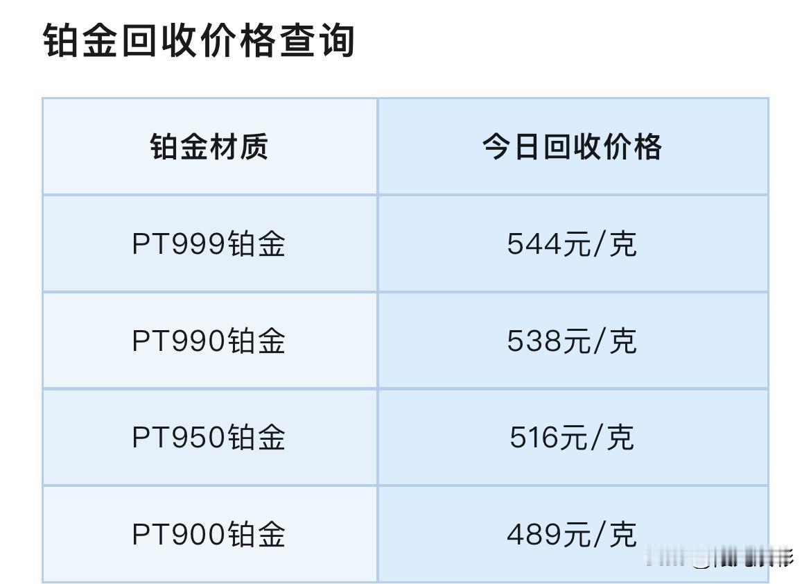 今日铂金、钯金价格整体下跌了 那么,对于想购买铂金、钯金的人来说肯定想了解铂金、钯金时时价格。 那么先来看看,今天铂金回收报价多少钱一克了? PT999铂金回收价格544元/克,PT990铂金回收价格538元/克,PT950铂金回收价格516元/克,PT900回收价格铂金489元/克 同昨天铂金各品种回收报价相比较,今日铂金回收价格整体下跌了。 PT999铂金、PT990铂金、PT950回收价格各分别下跌了14元/克。 其中,PT900铂金回收价格下跌了13元/克。 再来看看,钯金回收价格是多少钱一克? Pd999钯金回收价格373元/克,Pd990钯金回收价格369元/克,Pd950回收价格钯金354元/克,Pd900钯金回收价格335元/克。 同昨日钯金回收报价相比较,今天钯金回收价格也整体下跌了 Pd999钯金、Pd990钯金、Pd950钯金、Pd900钯金回收价格分别下跌了5元/克。 今日1月30日(周五),黄金白银上演大幅波动行情,早前开盘现货黄金反弹,触及5450.95美元,随后,黄金直线跳水,现货黄金向下触及5111.65美元的低点,日内波动340美元。白银、铂金、钯金等贵金属价格集体下跌。现货白银最低至107.7美元,日波动近11美元。 有分析师表示黄金和白银期货出现回调可能意味着价格已触及近期高点。铂金与钯金价格同步下跌。 注意:铂金回收有这以下4个知识点,特别的重要,谨防上当吃亏。 第一,铂金回收是不需要发票和以前的购买凭证的。如果有人跟你说因为没有发票要扣你手续费,那他一定是在坑你。 第二,铂金回收是没有折旧费一说的,不管你是戴了几十年还是刚刚买的,回收的时候只看重量和纯度,只要纯度是3个9以上的,回收价格都是一样的。 第三,卖之前一定要知道自己首饰的精准克重,以防被其他人偷秤。 第四,铂金回收就是按照当天的国际金价减个几块钱一克回收,所以要提前查一下当天的国际金价。 只要注意这4点,根本没有人能够坑得到你。 最后说声,所有信息,都只是提供参考价值! 投资有风险,理财需谨慎!铂金价格 铂金回收行情 铂金价格波动 铂金回收价 铂金行情分析 白银铂金回收 钯金价格