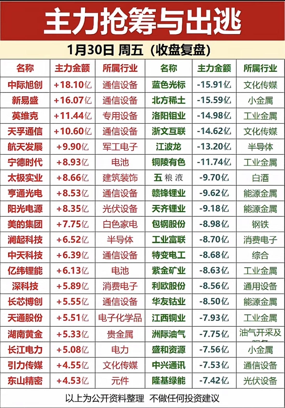 1月30日主力抢筹与出逃:1月30日市场动态分析 主力资金动向:通信设备、文化传媒获大幅流入,小金属、半导体遭抛售,行业分化明显