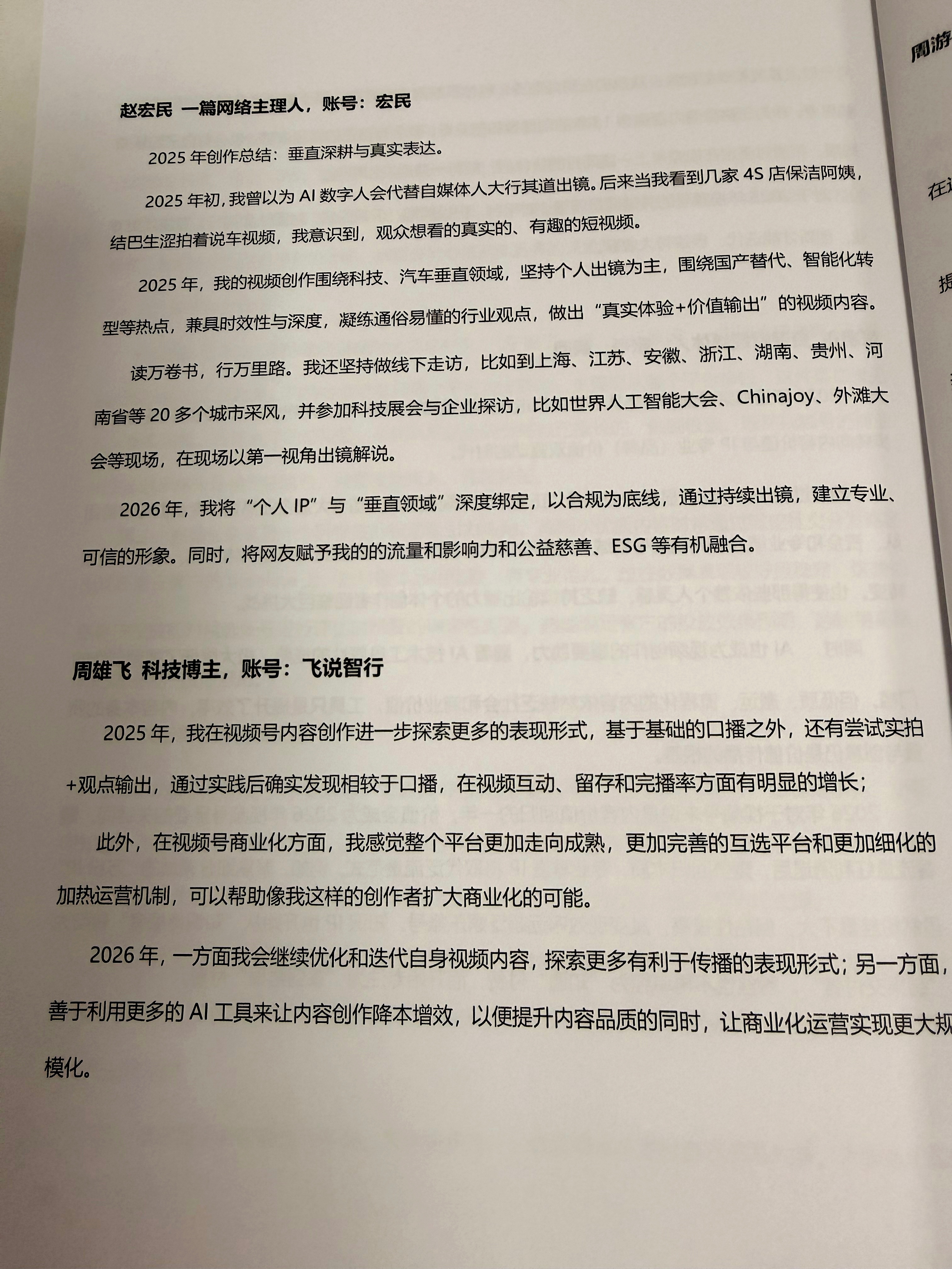 我还坚持做线下走访,比如到上海、江苏、安徽、浙江、湖南、贵州、河南省等20多个城市采风,并参加科技展会与企业探访,比如世界人工智能大会、Chinajoy、外滩大会等现场,在现场以第一视角出镜解说。2026年,我将“个人IP”与“垂直领域”深度绑定,以合规为底线,通过持续出镜,建立专业、可信的形象。同时,将网友赋予我的的流量和影响力和公益慈善、ESG等有机融合。并展望2026年短视频创作想法。