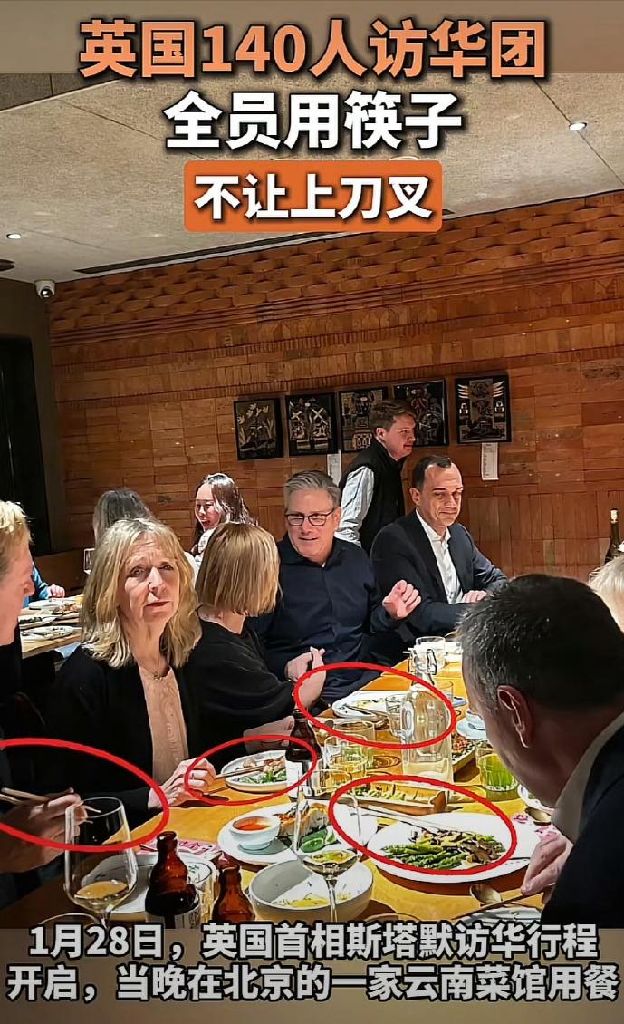 细节了!英国访华团140人拒用刀叉,全员拿筷子干饭 英国首相斯塔默带着140人的访华团来北京,首餐直接选了云南菜馆,一个细节直接刷屏! [what]餐厅主厨:早就备好了刀叉,知道外国人平时习惯用这个,怕他们用筷子不方便。 结果万万没想到,140个人,从首相到随行人员,全员主动不用刀叉,清一色拿起筷子干饭,压根没让服务员把刀叉端上桌。 [what]主厨还说:看他们用筷子的手法都挺熟练,明显是提前做过功课、练过的,不是硬撑着装样子,是真的用心了! 他们来吃云南菜,品的是中国烟火气;不用刀叉用筷子,敬的是中国文化。140人整齐划一的举动,比说一万句“友好合作”都管用!