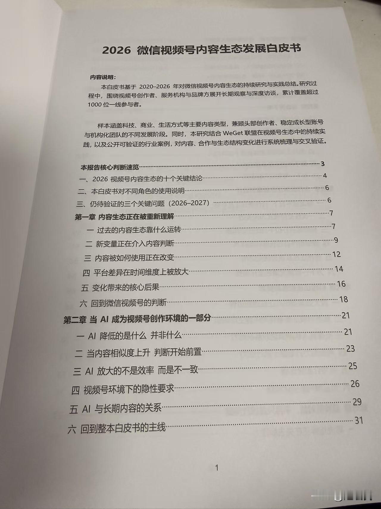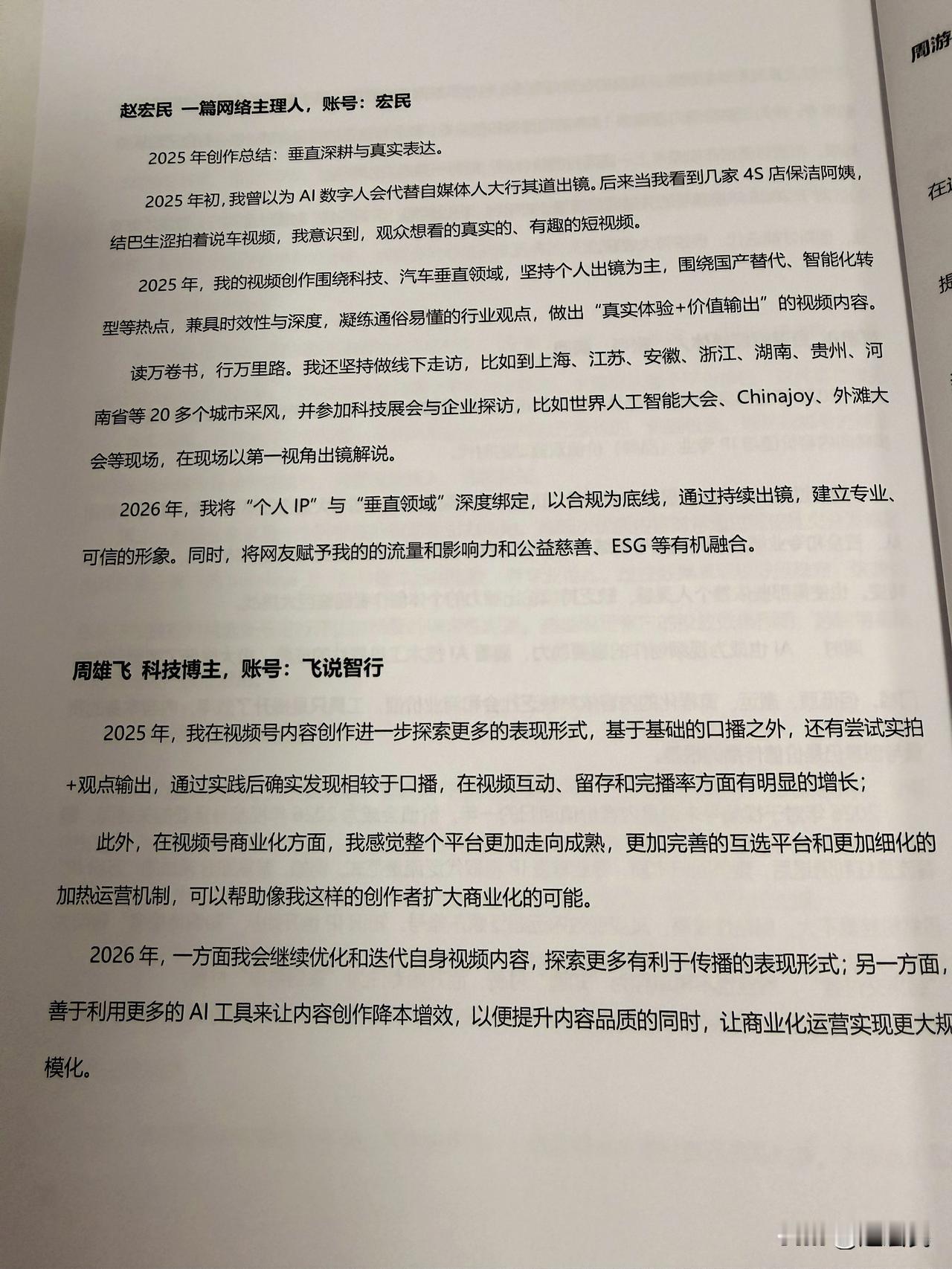 在《2025年微信视频号内容生态白皮书》中,我谈了谈2025年我的视频创作总结——垂直深耕与真实表达。 2025年初,我曾以为AI数字人会代替自媒体人大行其道出镜。 后来当我看到几家4S店保洁阿姨,结巴生涩拍着说车视频,我意识到,观众想看的是,真实的、有趣的短视频。 2025年,我的视频创作围绕科技、汽车垂直领域,坚持个人出镜为主,围绕国产替代、智能化转型等热点,兼具时效性与深度,凝练通俗易懂的行业观点,做出“真实体验+价值输出”的视频内容。 读万卷书,行万里路。 我还坚持做线下走访,比如到上海、江苏、安徽、浙江、湖南、贵州、河南省等20多个城市采风,并参加科技展会与企业探访,比如世界人工智能大会、Chinajoy、外滩大会等现场,在现场以第一视角出镜解说。 2026年,我将“个人IP”与“垂直领域”深度绑定,以合规为底线,通过持续出镜,建立专业、可信的形象。同时,将网友赋予我的的流量和影响力和公益慈善、ESG等有机融合。并展望2026年短视频创作想法。