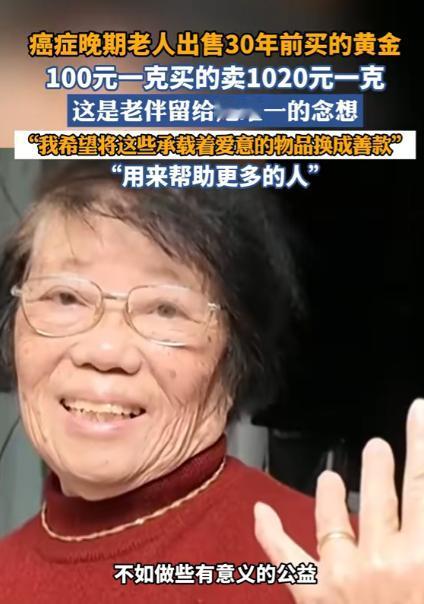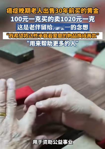 泪目!北京一87岁老太患癌,她卖了自己30年前的2件黄金首饰,当初是100元每克买的,如今卖了1020元一克,很多人都以为老太是为了筹钱给自己治病,谁知,她笑着说:“我想拿这些钱帮助更多的人。” 北京,街边的黄金回收店刚开门没多久,店员就听见门口传来轻轻的推门声,87 岁的老太扶着门框慢慢走进来,头上戴着毛线帽,露出来的鬓角全是银丝。 手背上爬满了老年斑,还带着一点因化疗留下的苍白,她把拐杖靠在柜台边,又慢慢从贴身的斜挎布包里掏出一个叠得方方正正的红绸布包,指尖捏着布包的边缘,轻轻摩挲了两下,才抬眼看向店员。 这红绸布包里,是老太藏了三十年的两件黄金首饰,一个素圈金戒指,一个小小的金福字吊坠,也是老伴走后留给她的唯一念想。 三十年前的北京,黄金还不是随随便便能买到的东西,那时候的金饰大多要去指定的金店挑选,计划经济的余韵还在,买金的钱也得攒上许久。 老太记得很清楚,那时候街坊邻里置办金饰,大多是挑小巧的款式,老伴却咬着牙,给她买了这两件首饰,说是结婚二十周年的纪念。 那一天他们去的是京城有名的金店,排队的人挤着挨着,老伴把刚取的工资揣在贴身的口袋里,攥得紧紧的,买到首饰后,还小心翼翼地用红绸布包好,塞到她手里,说这金饰能留一辈子,念想也能留一辈子。 这三十年里,老太从没舍得戴过几次,就把首饰收在樟木盒子里,放在衣柜最深处,偶尔想老伴了,就拿出来擦擦,素圈戒指的边缘被磨得发亮,福字吊坠的纹路也依旧清晰,每摸一次,就想起当年老伴笑着递过布包的样子。 如今老太得了癌症,已是晚期,化疗的滋味磨人,可她从来没跟街坊邻居喊过苦,也没跟远在外地的孩子提过难处。 这次来卖金饰,她前一天晚上翻出樟木盒子,把红绸布包打开又叠上,反复了好几遍,指尖抚过冰凉的金饰,心里不是不不舍的。 这是老伴留在世上,独独属于她的东西,跟着她走过了三十年的春夏秋冬,见证了她一个人的三餐四季,可转念一想,自己这身子骨,怕是撑不了多久了,留着这些身外之物,又有什么用呢。 店员接过红绸布包,打开时看到这两件款式古朴的金饰,随口说了句阿姨您这金饰放得真仔细,跟新的似的。 说着便按照流程,用镊子轻轻夹起金饰,先放在电子天平上称重,红色的数字跳了几下,稳稳停住,又拿起喷枪,蓝色的小火苗舔舐过金饰表面,黑色的氧化层瞬间消失,再用清洗液冲过,擦干后复称,确认克重分毫不差。 随后店员报出当日的回收价,1020 元一克,一边敲着计算器,一边下意识地问了句,阿姨您这金饰留了三十年,现在金价这么高卖了,是家里急用,还是给自己治病添点钱啊。 这话一出,店里原本等着的两位顾客也看了过来,看着老太单薄的身子,还有脸上难掩的憔悴,心里都想着,这老太太定是得了病,急着用钱治病,才舍得把珍藏了三十年的金饰拿出来卖。 面对众人的目光,老太只是轻轻摇了摇头,她看着店员,声音虽然有些沙哑,却字字清晰,我不用这钱给自己治病,我得了癌症,日子不多了,也花不了什么钱了。 这两件金饰,是我老伴留给我的唯一念想,跟了我三十年,摸一次就想一次他,可我快离世了,留着这些东西,也没什么意义。不如换成钱,拿这些钱帮助更多的人,能帮一点是一点。 年轻的店员回过神来,眼眶微微泛红,赶紧低头继续算钱,算完后抬头跟老太说,阿姨,我给您把手续费免了,这钱您全拿着。 老太却摆了摆手,伸出手轻轻推了推店员递过来的钱,说该多少是多少,一分都不能少,规矩不能破,你们做买卖也不容易,我不能占这个便宜。 店员拗不过老太,只好按规矩扣了手续费,把现金数好,用牛皮纸包好,递到老太手里。老太接过纸包,捏了捏,确认数清了,便小心翼翼地揣进贴身的棉袄口袋里。 她又把红绸布包叠好,放回斜挎布包里,拿起拐杖,慢慢扶着柜台起身,跟店员道了谢,便慢慢走出了回收店。 出门后,老太想着,这钱要赶紧捐给社区的公益基金,这些钱虽然不多,但是能给独居老人买些米面油,能给孩子买些文具和书本,就够了。 老伴这辈子最心善,总想着帮衬别人,当年邻居家有难处,他总是第一个伸手,如今自己把他留下的念想换成钱,去帮更多的人,他在天上看到了,肯定也会高兴的。 这世间最珍贵的从不是冰冷的金饰,而是藏在普通人心底的温柔与善良,哪怕年过八旬,哪怕身患重病,这份纯粹的善意,也能像冬日里的一缕暖阳,悄悄暖了人心,也照亮了前路。 对于这件事,您有什么想说的吗?欢迎评论区留言讨论。 信源:海报新闻2026-01-25——《癌症晚期老人出售30年前买的黄金,100元一克买的卖1020元一克,这是老伴留给她唯一的念想……》