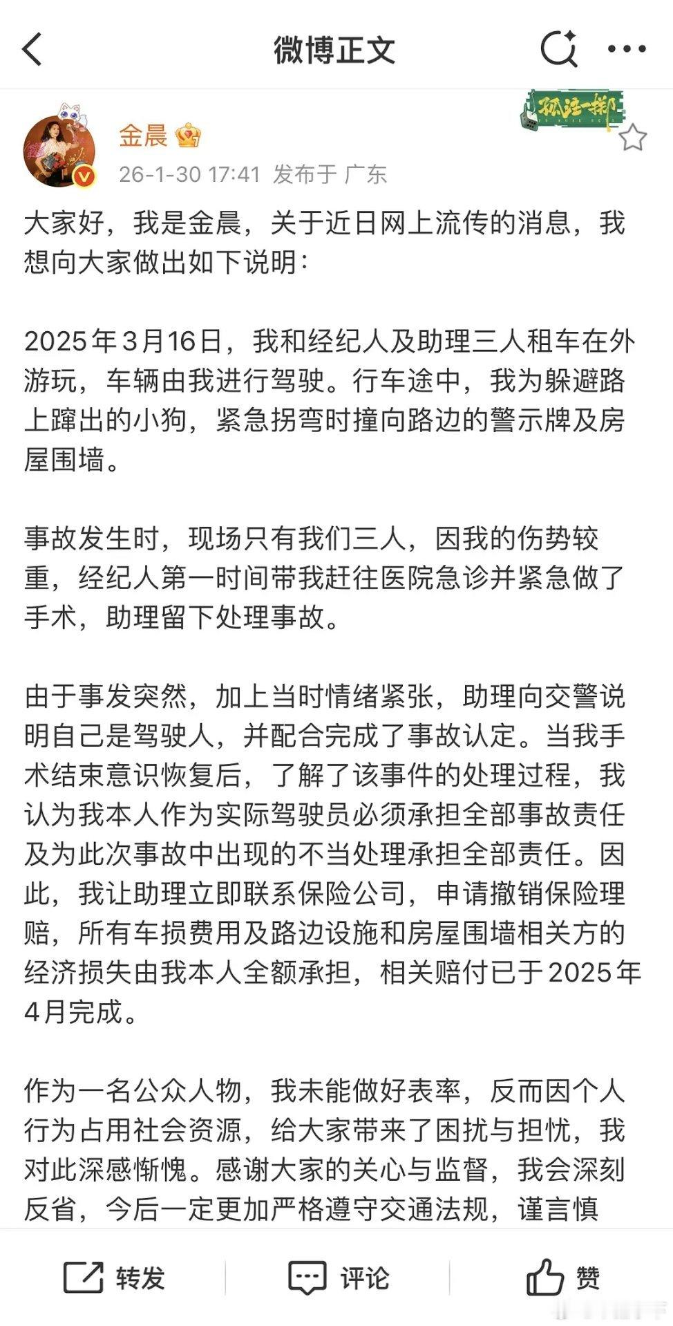 金晨的回应来了金晨被曝肇事逃逸被撞墙农户已获赔