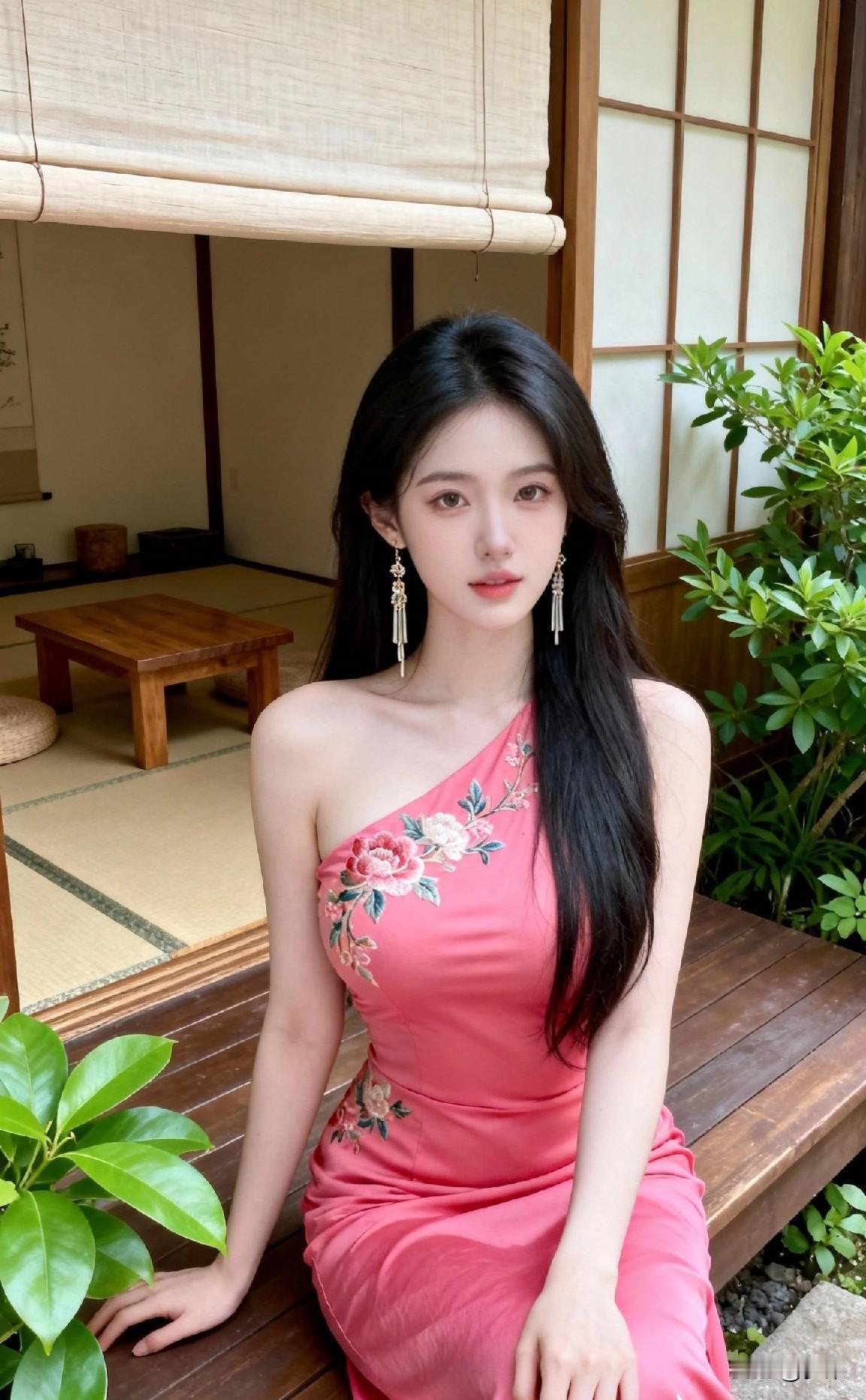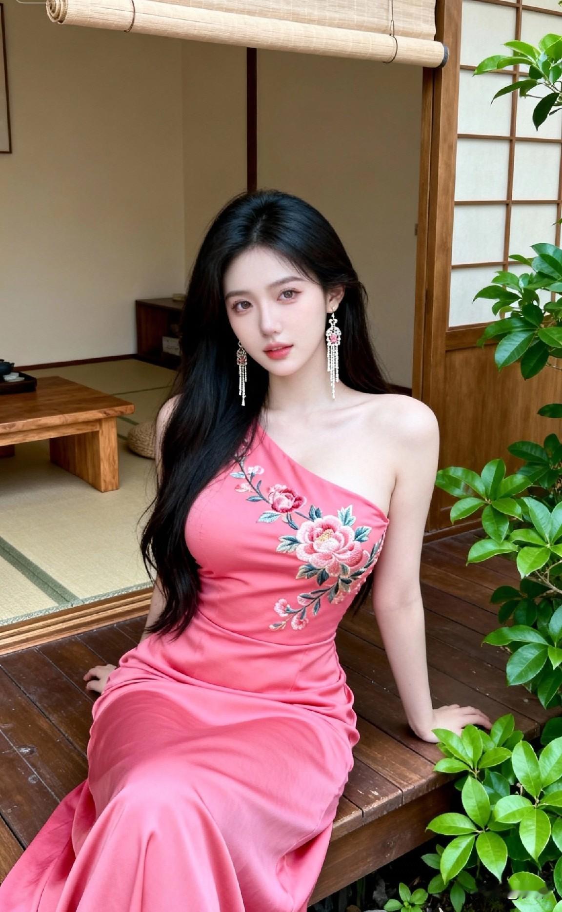 太美了,穿着粉色裙子的美女在室内坐着