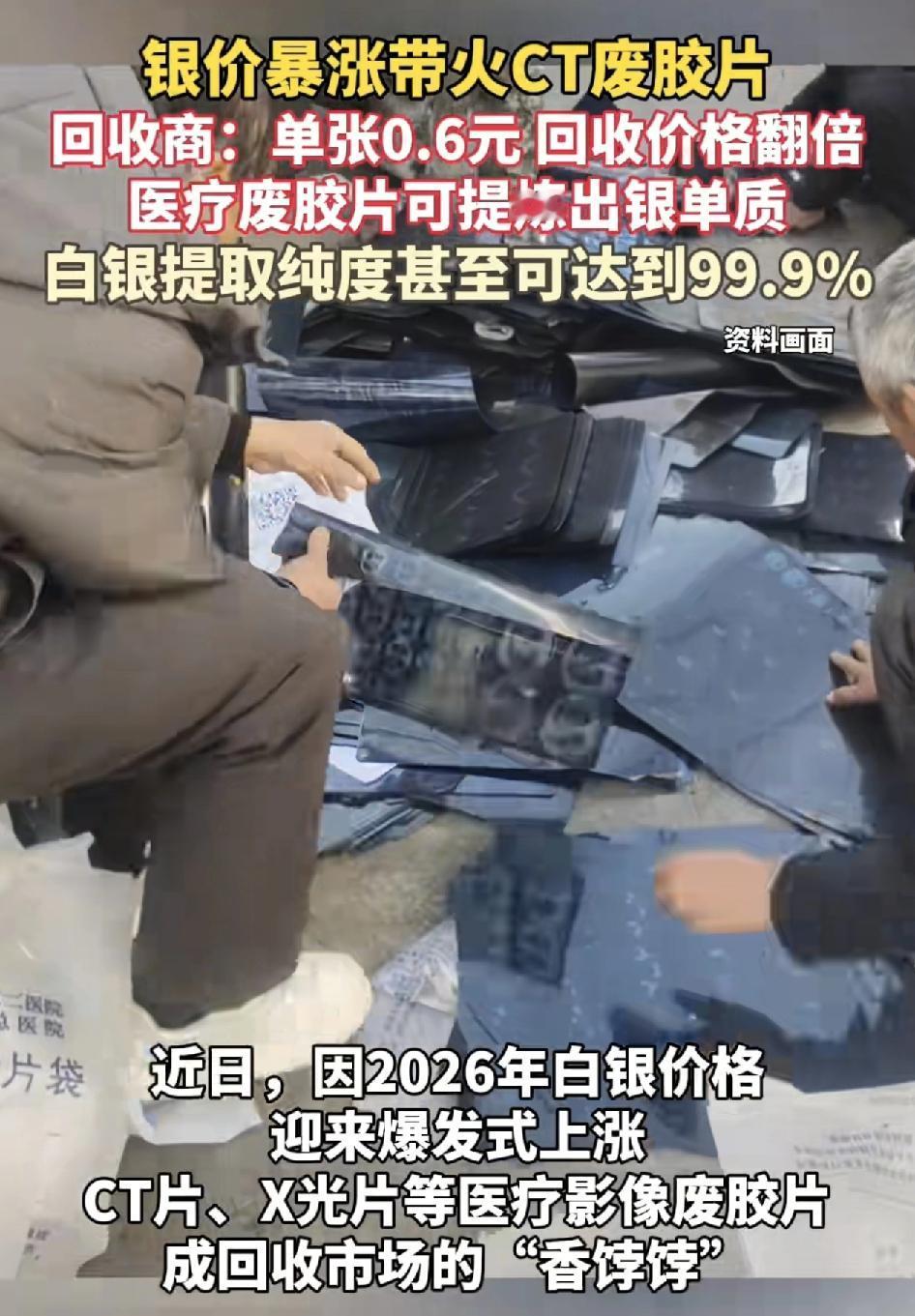 2026年的银价持续上涨,带火了,医院影像废胶片, CT片,x光片,现在单张的回收价格达到了6毛钱。底片可以提出银质,白银提出来的纯度达到99.9%。不过业内人士提醒大家千万不要自行的去提炼银子,很有可能造成大气环境污染,甚至可能涉嫌违法。