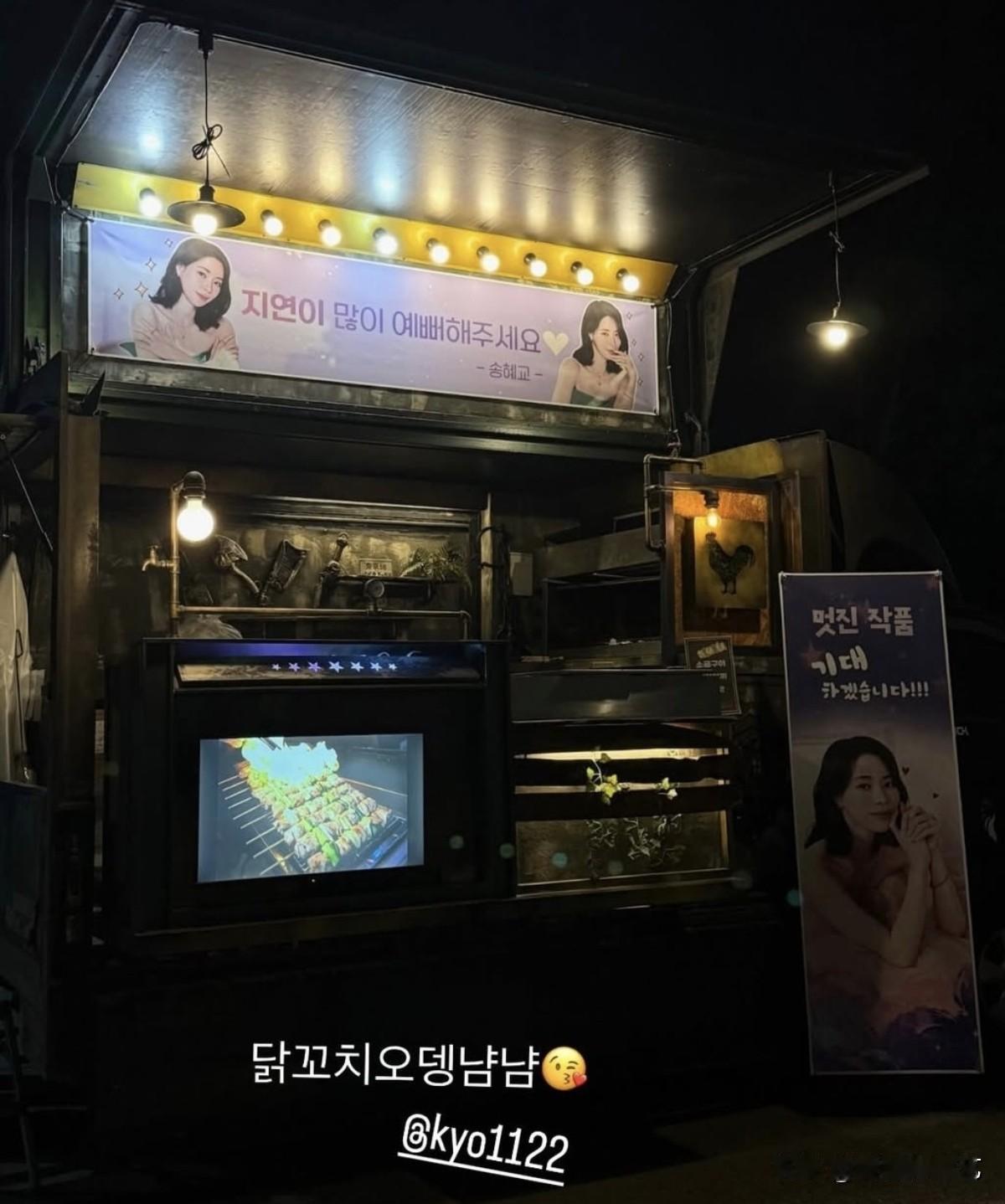 28日,演员林智妍在自己的Instagram上写道“姐姐送的鸡肉串和鱼饼,好好吃”,并上传了照片。 照片中,宋慧乔给林智妍的电视剧拍摄现场送去了点心车。林智妍手捧咖啡,对着镜头露出可爱的表情。 另外,点心车上贴满了宋慧乔的温馨留言“请多多支持智妍”、“加油,美好新世界的演员和工作人员们”、“期待精彩的演出”等等,营造出温馨的氛围。