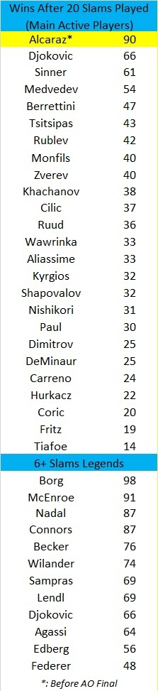 生涯前20站大满贯胜场榜中,阿卡位列现役第一,历史上暂时仅次于麦肯罗(91)和博格(98)。超越了同胞前辈纳达尔的87场了。