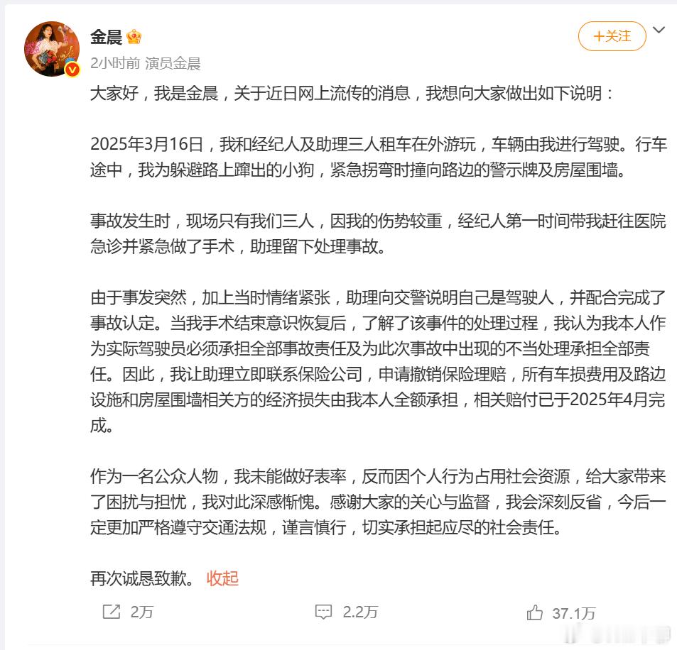 金晨致歉,说自己开车,当时受伤较重,所以第一时间去的医院。