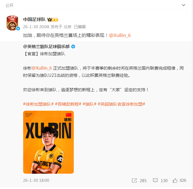 【#国足为徐彬加油#】#期待徐彬在英格兰赛场上的表现# 今日,官宣,徐彬正式加盟狼队,将于本赛季的剩余时间在英格兰国内联赛完成租借,同时保留为狼队U21出战的资格,以此积累英格兰联赛经验。转发上述微博:加油,期待你在英格兰赛场上的精彩表现!