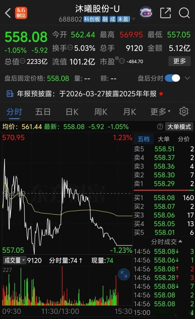 沐曦股份跌的太惨了,上市暴涨一天后持续下跌,今天盘中跌破558再创新低。第一波下跌跌到566后反弹了几天,但是仅到655就开始持续下跌,离高点895有相当远的距离。周线看最近连续下跌了3周,日线看成交量越来越小,越来越多股民离场,成交额快速回落到10亿内,都去炒其他题材股了,估计很难回来了,追高股民惨不忍睹。