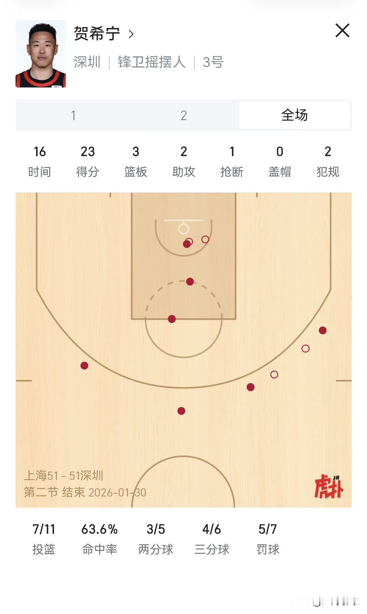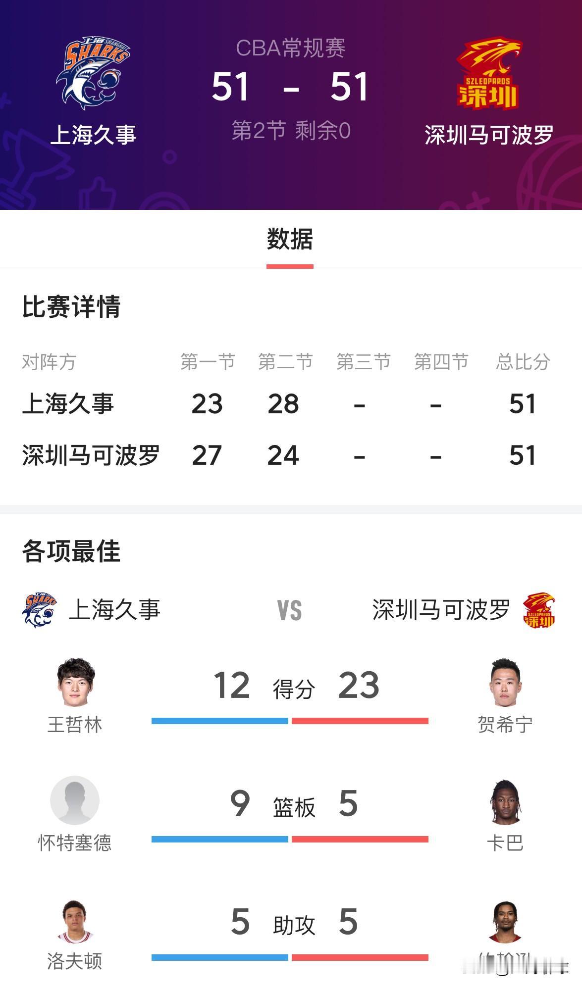 贺希宁半场23分!上海久事主场对阵深圳马可波罗半场战成51平,“深圳避雷针”贺希宁上半场手感爆发,拿下23分3篮板2助攻1抢断,三分球6中4,甚至出现正面打板命中的三分球,史密斯、王浩然手感还没有找到,期待下半场贺希宁延续手感,突破生涯最高单场44分的纪录,史密斯、王浩然早点爆发,拿下上海久事,完成赛季双杀!