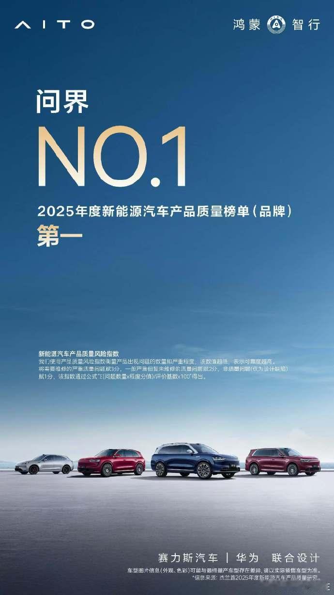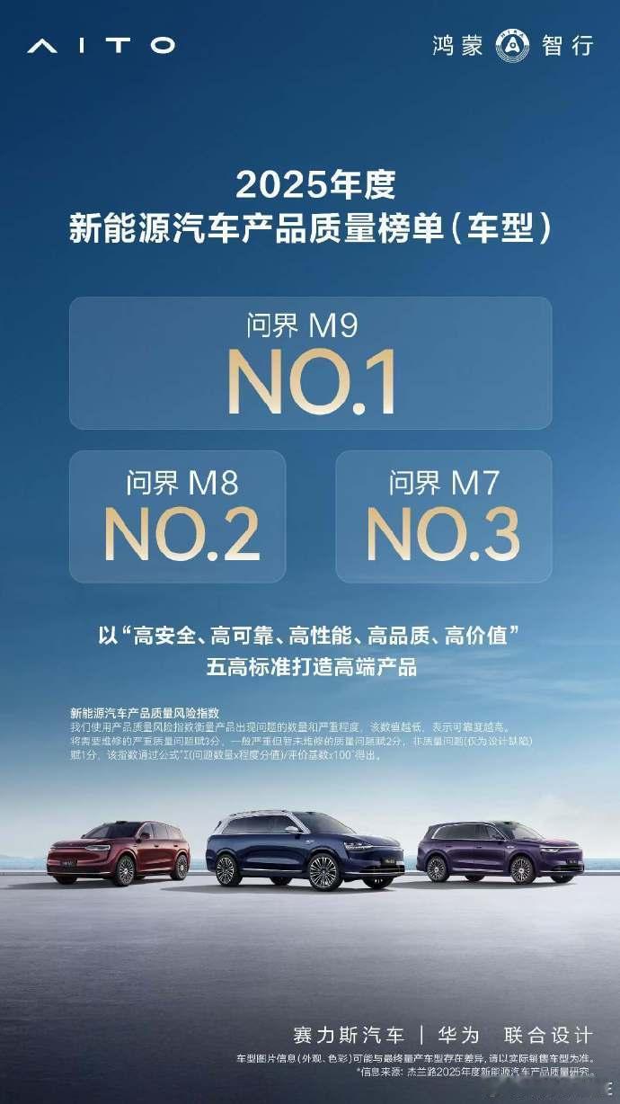 问界获2025年度新能源汽车产品质量品牌榜第一。其中问界M9、M8、M7包揽中大型及以上SUV前三名。作为参考:该榜单由汽车分析机构杰兰路基于5700余份车主样本调研发布,综合评估质量问题数量与严重程度,覆盖57个新能源品牌。问界m9