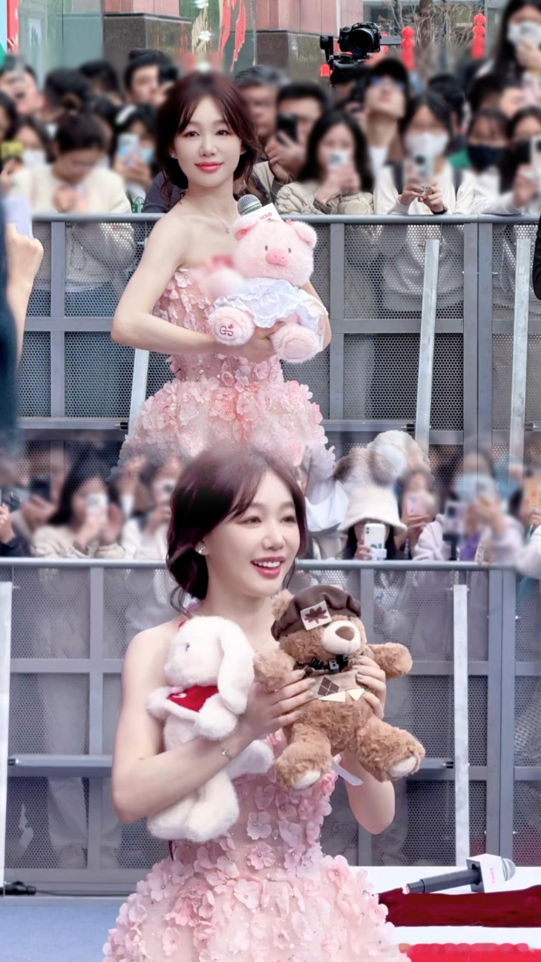 徐梦洁在广州用粤语拜早年谁懂啊!剧里是拽到没边的暗黑洋娃娃,线下直接变身甜到冒泡的花仙子!徐梦洁今天这身粉色花瓣抹胸裙精致到发光,笑起来软萌到心都化了!现场可爱三连拍甜度超标,粤语“恭喜发财”一开口就讨喜到不行,还给玩偶定制同款娃衣,细节里全是可爱,这波直接被拿捏!