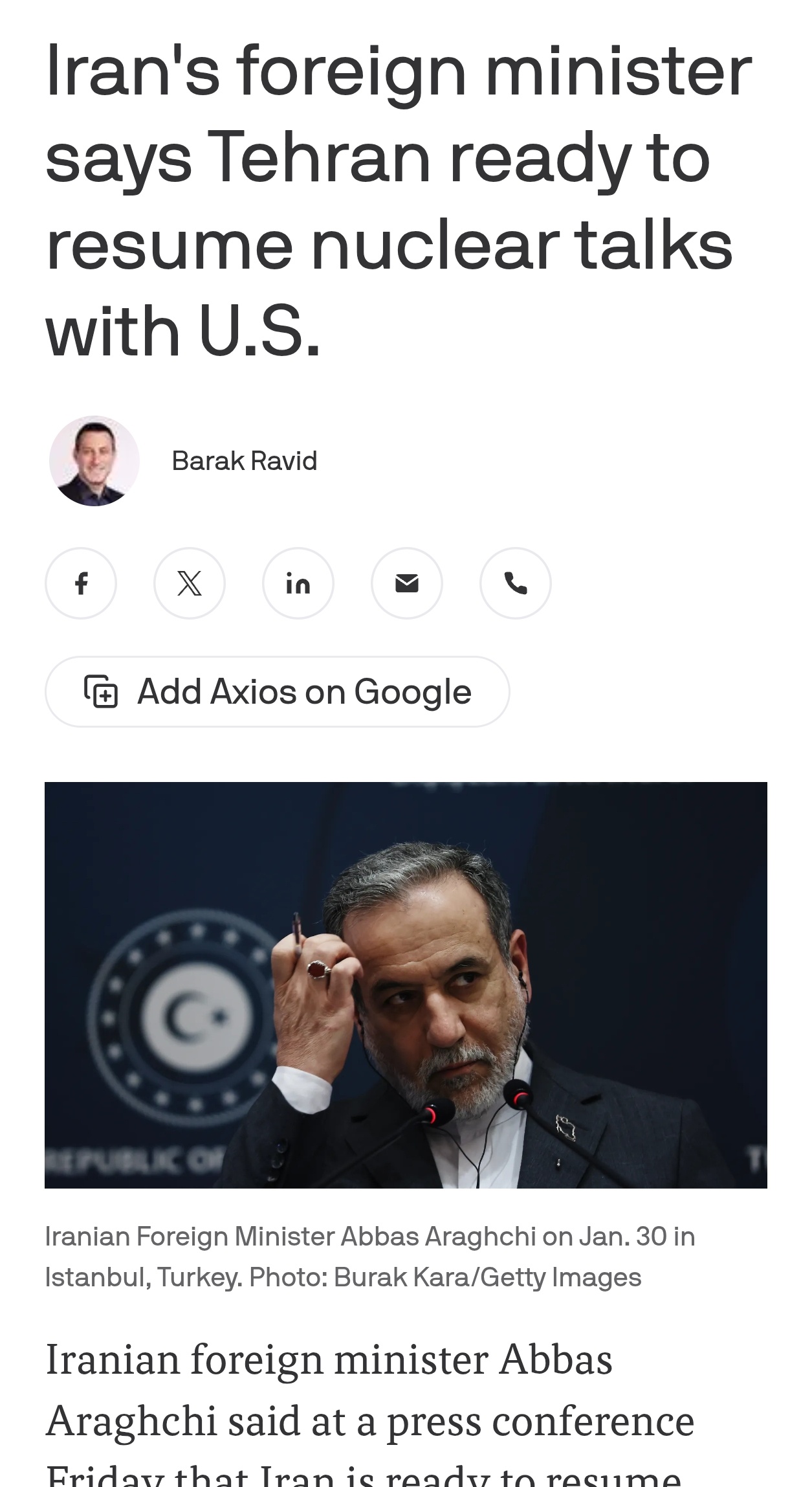伊朗外交部长阿巴斯·阿拉格奇周五在新闻发布会上表示,伊朗准备与美国恢复核谈判,但他强调特朗普政府需要停止威胁对伊朗发动攻击。伊朗局势