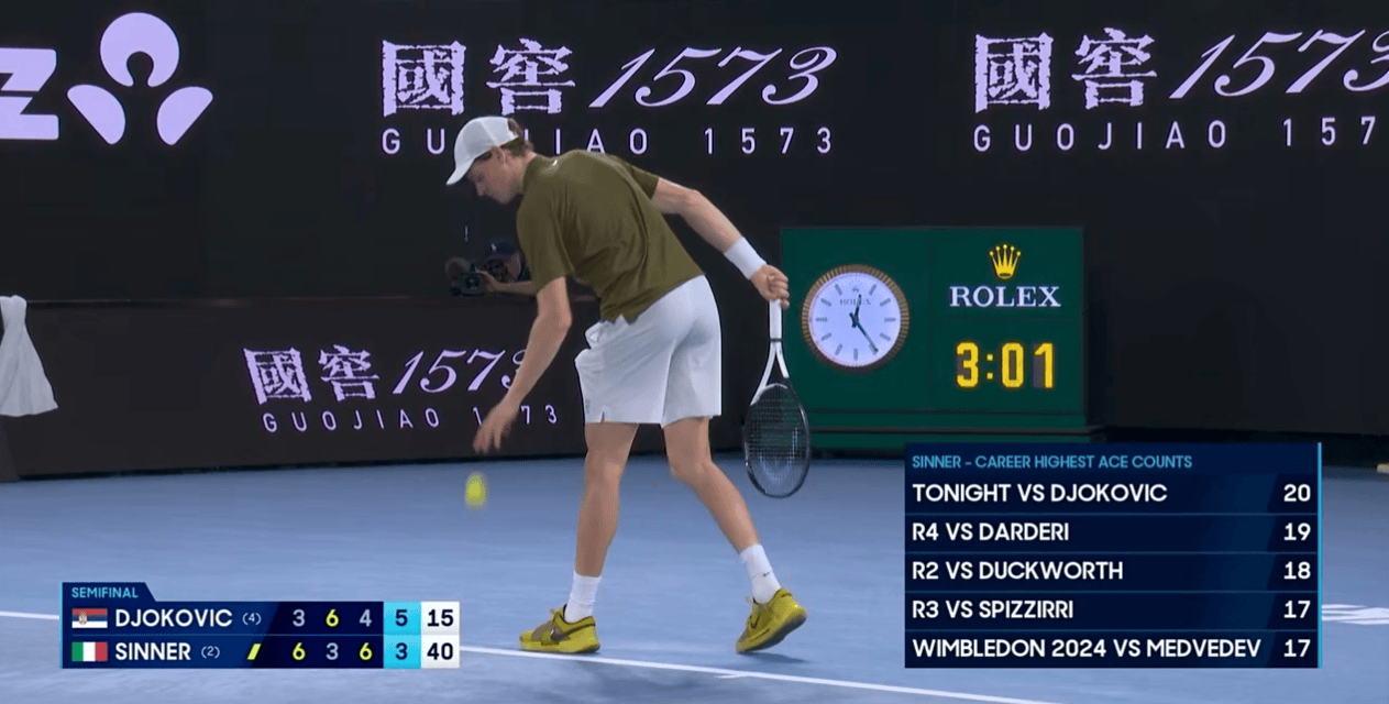 辛纳在第4盘第9局发出两个ACE球,整场比赛ACE球数来到21个,创造了个人职业生涯单场大满贯ACE球数量。