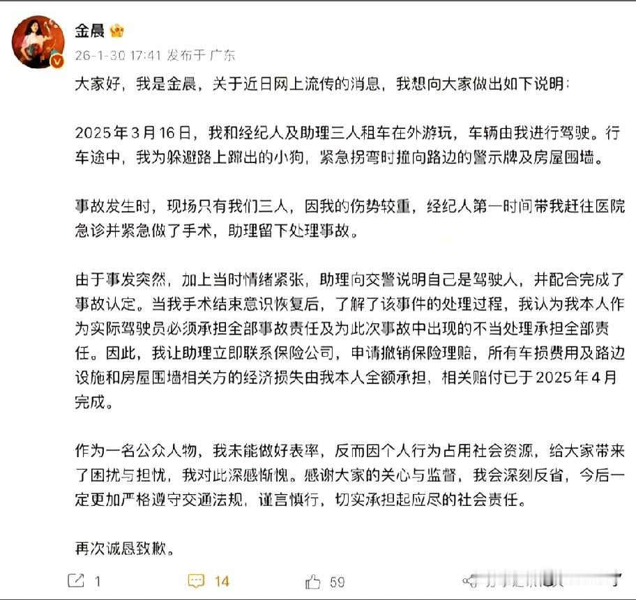 金晨这事确实有点让人看不懂!事故发生都快一年了,突然又被翻出来。 她当时撞的是路边警示牌和围墙,也没撞到人,助理却偏偏站出来顶包,这操作实在想不通。如果是因为酒驾或者“吸了”,经纪人、助理都在场,怎么会让她自己开车?说是骗保吧,她最后又没申请理赔。 难不成当时车上还有其他人?还是说真的就只是怕事件曝光影响形象?可如果真是这样,这处理方式太欠考虑了…… 才引来这么多猜测,越描越黑!