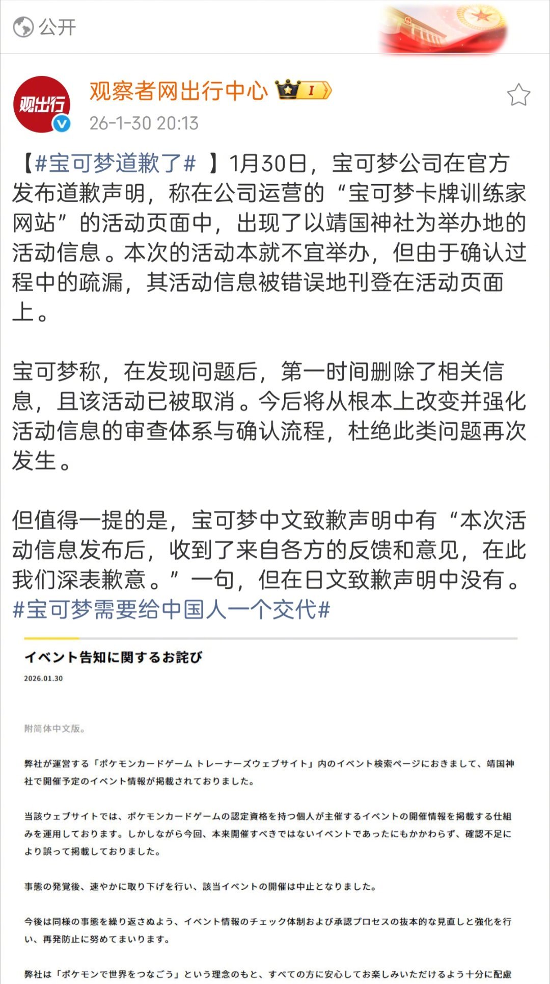 宝可梦道歉了,这是中国互联网舆论力量的胜利,也是正义的胜利。中国公众发出的信息很清楚:日本的大公司都须离靖国神社远一点。老胡在此还要加一句:离日本极右翼也远一点!他们需要了解中国人最讨厌的日本军国主义和现代极右翼符号的清单,并且远离TAZ们。一旦出了问题,他们唯一应当最做的就是诚恳道歉并改正。来中国做生意,就须尊重中国公众的感受,这是普天下共同的规则和道理。靖国神社涉及大是大非,没有妥协的余地。
