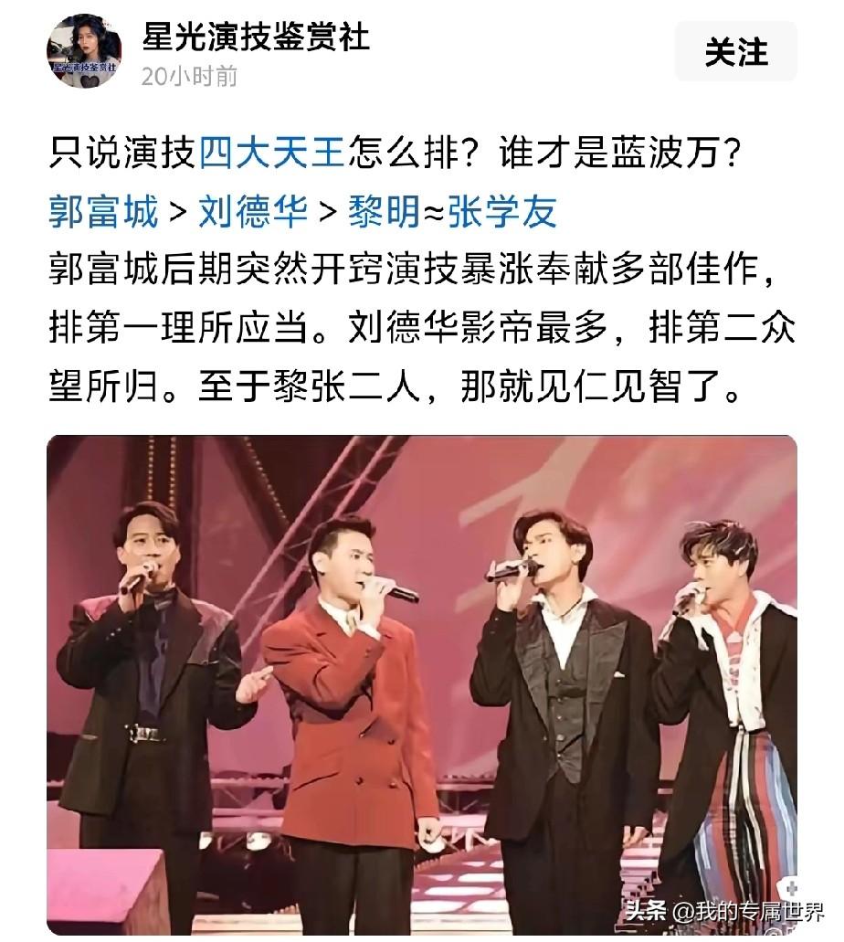 四大天王演技排名?首先刘德华和黎明在演技上存在感最低,但也奇怪刘德华拿的影帝最多三个金象两个金马,而黎明是四个人中最先拿到金马影帝,但说两人演技在大众心里只能评价一般,张学友天赋极佳,可是重心没往电影上面发展,给人印象就是天赋最好的一位,郭富城由早年歌唱事业重心转到电影事业,敢于选择挑战不同角色,应该是四个人中尝试不同角色最多的一个,2个金马1个金象影帝全是通过小成本电影获得,可见郭富城在剧本上经过精心打磨和研究,四个人谁演技最好张学友和郭富城得到的认可要比刘德华和黎明要高,谁排第一这个众说芸芸,结果永远争论不断,粉丝各说各有理。