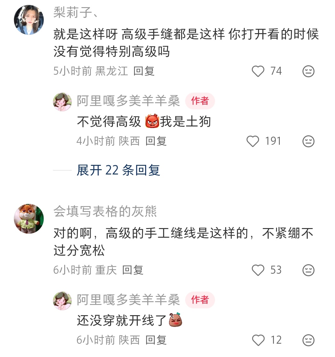 评论都说这是好货,说博主不识货。但是不管是不是手工的,开线了就是有问题啊。花那么多钱,买个总是开线的货