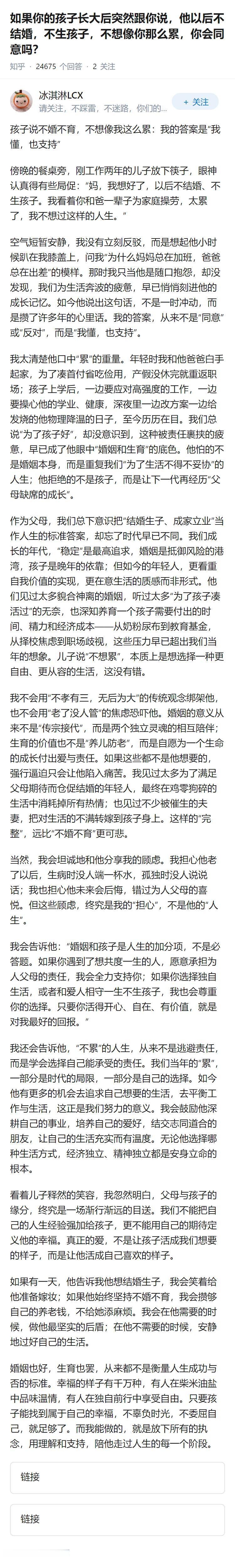 如果你的孩子长大后突然跟你说,他以后不结婚,不生孩子,不想像你那么累,你会同意吗?