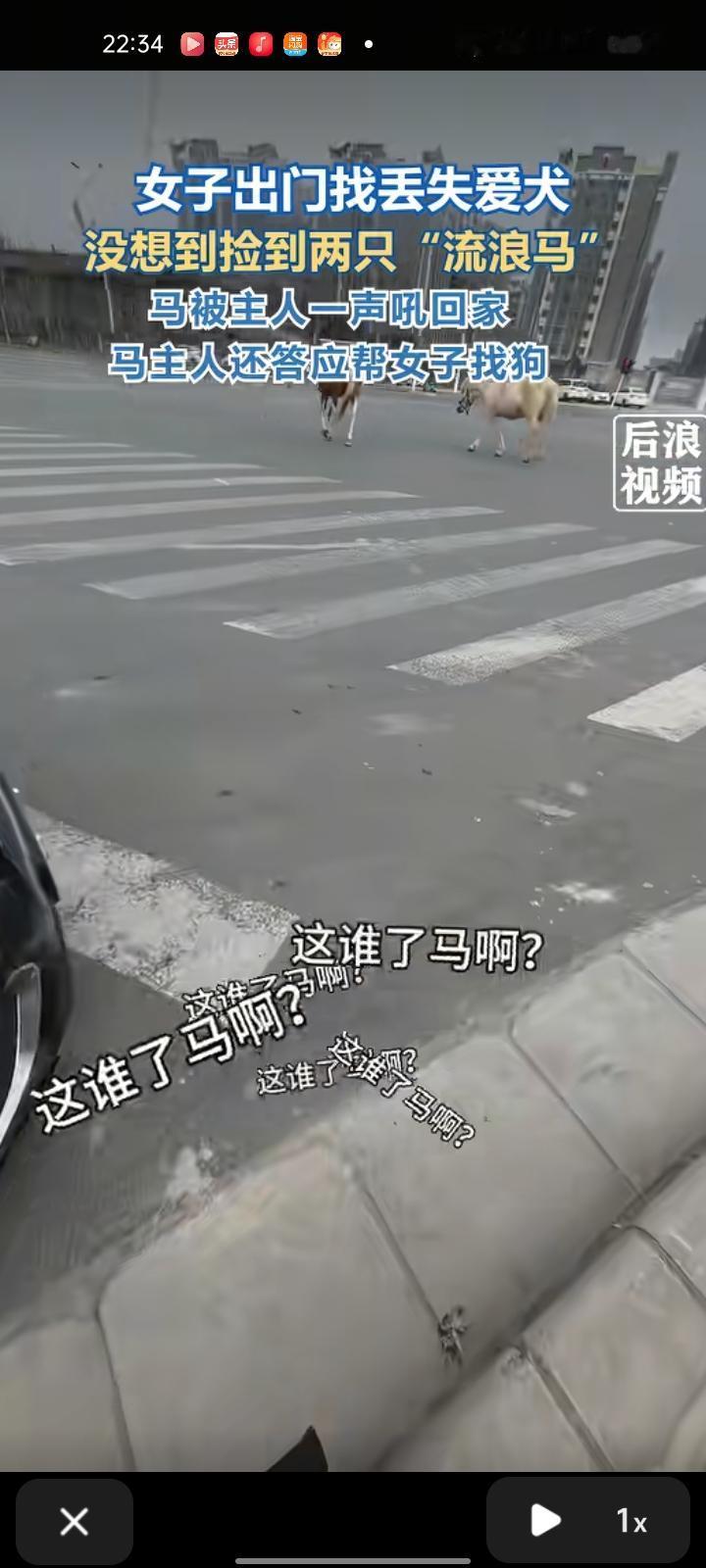 1月29日,河南郑州。女子外出找自家狗时,意外遇到两头流浪马,还是第一次见过。只见它们俩横冲直撞的在马路上走着吃着,更是潇洒的在马路上来回穿梭,试图想指引它们走人行道都无济于事。担心它们被车撞,就求助专业朋友,他表示,马主人会承担一切后果。 经过了专业朋友的指导下,女子把马赶到人少车少的地方,然后搜索附近的马场,给马场打电话,说两只马跑了。马主人赶来后一声吼喊它们回家,还答应帮女子找狗