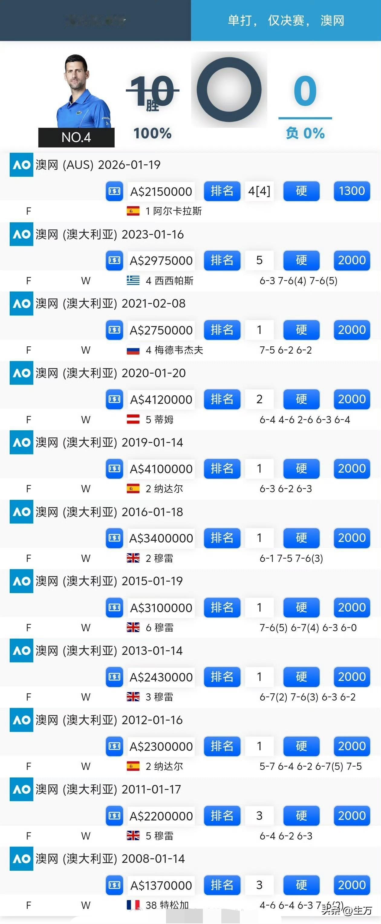 德约科维奇澳网决赛胜率100%太恐怖了! 从2008年开始,一直到今天,德约