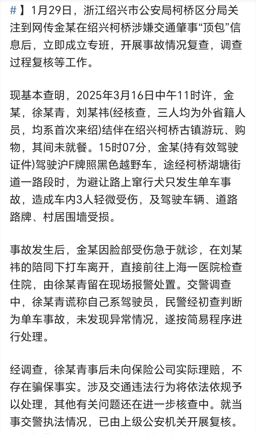 警方通报涉金晨交通事故“事故发生后,金某因脸部受伤急于就诊,在刘某祎的陪同下打车离开,直接前往上海一医院检查住院,由徐某青留在现场报警处置。交警调查中,徐某青谎称自己系驾驶员,民警经初查判断为单车事故,未发现异常情况,遂按简易程序进行处理。”