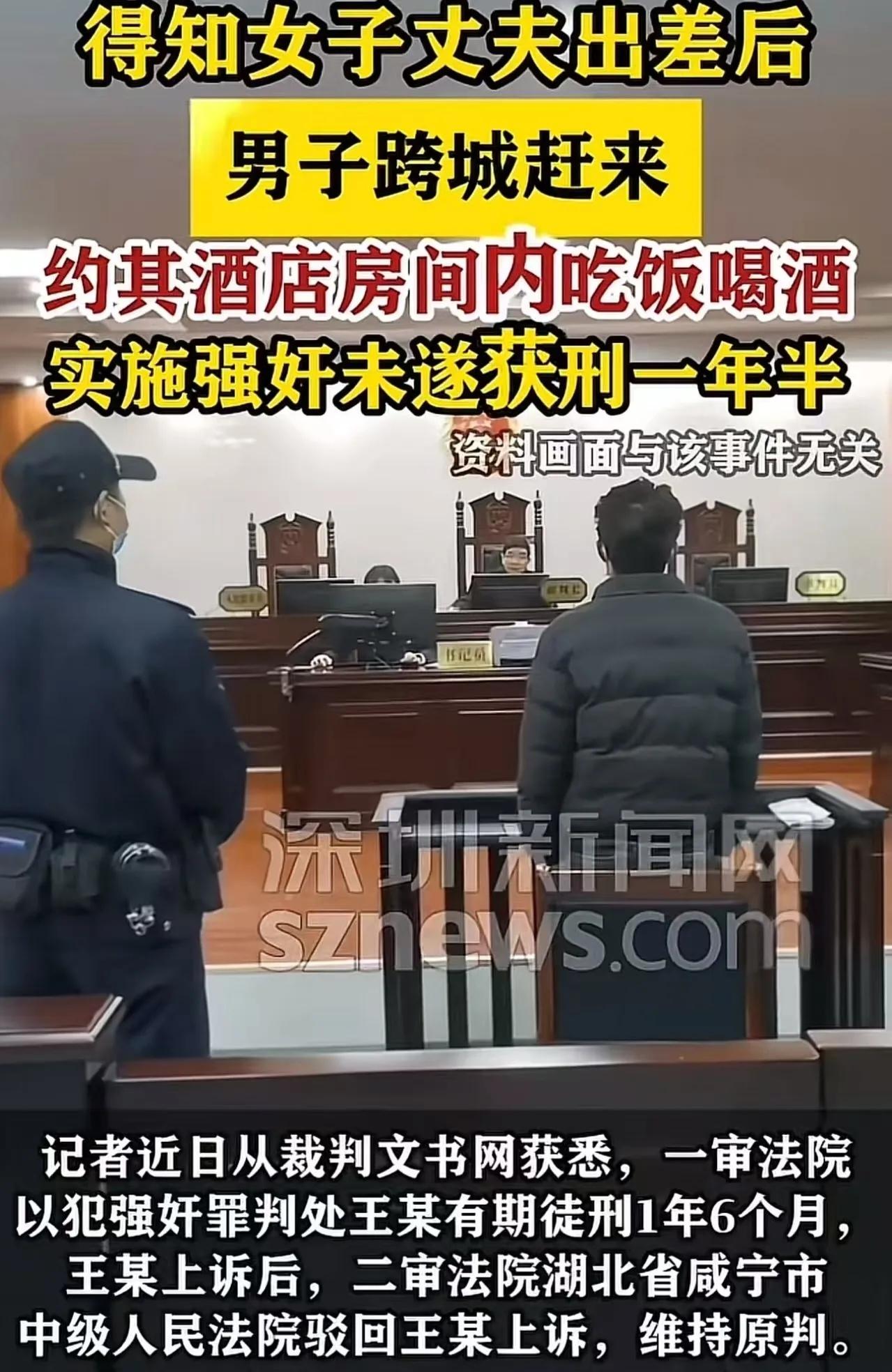 “我裤子都没脱,凭啥判我强奸?!”男子庭上喊冤,法官的回应亮了! 一句“老公出差”,竟引来一场牢狱之灾。湖北咸宁的老王(化名)怎么也想不明白,自己只是去“见个网友”,怎么就变成了强奸犯? 这事得从去年10月说起。老王和女网友李女士在网上聊天时,对方随口提了句“老公出差了,一个人吃饭”。老王一听,觉得这是“机会来了”,当即表示要开车去陪她。 李女士明确拒绝:“我是有夫之妇,不合适。”但老王没理会,执意从武汉开车两个多小时赶到咸宁。 面对风尘仆仆的老王,李女士心软了,答应在酒店“见一面吃个饭”。可她没想到,老王早就订好了带床的客房。一进门,老王就送上一条合金项链,还点了外卖和啤酒。 几杯酒下肚,当老王开始动手动脚时,李女士立刻清醒,坚决要离开。老王却一把将她推倒在床,撕扯衣服,意图强行发生关系。李女士拼命反抗,身上多处被抓伤。幸好家人来电,她趁机报警才得以脱身。 事后,老王竟还振振有词:“她不同意为啥来酒店?我连她裤子都没脱下来,顶多是猥亵,怎么能算强奸?” 法院的判决给了他一记重锤。法官明确指出:是否构成强奸,关键看是否“违背妇女意志”,而不是“进行到哪一步”。 老王使用暴力压制反抗,其行为已进入强奸实行阶段,虽因对方反抗报警未能得逞,但已构成强奸罪(未遂)。 最终,老王被判处有期徒刑一年六个月。他不服上诉,二审维持原判。 这个案子在网上引发热议: “判得好!‘不’就是‘不’,哪来那么多‘半推半就’?” “女性去酒店、收礼物,绝不等于同意发生关系!” “给所有自作多情的人上了一堂法律课!” 其实,法律的红线非常清晰:同意必须是明确、自愿且可随时撤回的。 任何试图用暴力、酒精或道德绑架突破防线的行为,都是犯罪。 这件事也提醒大家,网络交友需谨慎,保持清醒边界感。但更重要的是——任何理由都不是伤害他人的借口。 你怎么看?你觉得女性在类似情境下该如何更好地保护自己? 来源:根据湖北省咸宁市中级人民法院刑事判决书及公开报道整理。