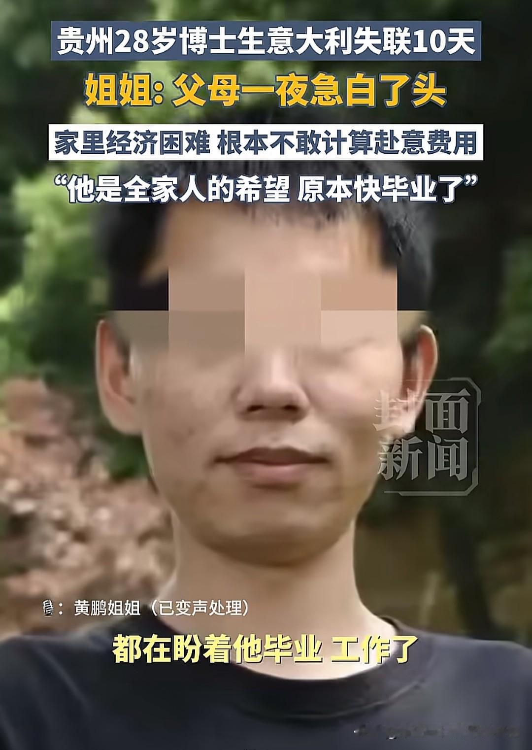 贵州28岁博士生黄鹏去意大利失联10天了,说起原因很多网友都想到了原生家庭的问题,因为他来自普通的农村家庭,父母常年在工地打零工维持生计,家里有高寿老人需要照顾,全家人的希望都指望他一个人了! 家里人希望他毕业后能拿高薪,能有更多的钱,然后改善家里条件,让全家人过上好日子。很多网友认为家庭压力太大,黄鹏很有可能轻生。笔者查了一下,他性格文静内敛,日常专注学术,此次前往意大利,既是为了收集博士论文所需的山地生态相关素材,也是为缓解长期科研压力而进行的调整。 由此可见黄鹏前往意大利的目的是公派交换学习,没有轻生的念头。而且公派交换学习通常被视为“高含金量且低成本”的升学路径,他参加的是国家留学基金委(CSC)项目,国家通常承担往返国际机票、签证费及留学期间的生活补助(含伙食、住宿、保险等),所以他没有生活压力,前途一片光明,像他这样能有一次改变命运的科研机会,怎么可能会轻生呢? 据了解,黄鹏1月19日独自前往意大利博尔扎诺省的加尔登纳谷山区,目的是为博士论文收集山地生态素材。该山区冬季气温低至零下10-20℃,且1月27日起开始降雪,单人徒步极易发生失温、迷路或滑坠事故。他的最后一次定位在1月21日的加尔登纳谷奥蒂塞伊,之后便失去所有踪迹。由此可见,黄鹏没有轻生的可能,家里能这样托举他已经很强了。