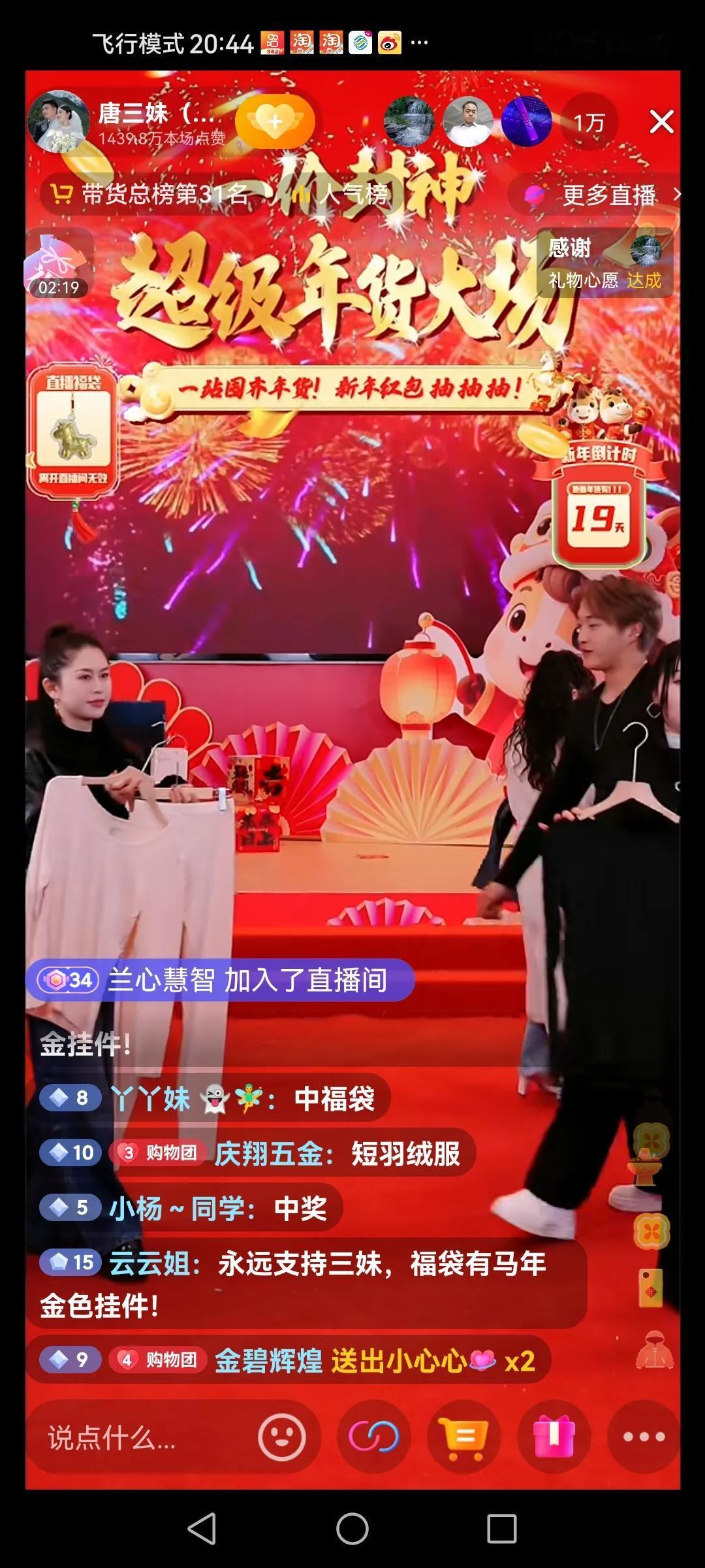 1月30号31号是唐三妹年货节专场,今天唐三妹是真的累,播了那么长时间。 但是她上的品性价比都很高,好多单品都是很快被抢光的,性价比超高,三妹的选品也好,质量把关也严,这么一年多以来,买过很多回,每次收到货用起来性价比都不错,希望31号这一天唐三妹的直播间也大卖。以上仅供参考,属个人意见!