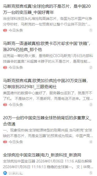 真是活久见!全世界都在盯着那几纳米的芯片打破头,结果马斯克一句话把大家整蒙了:现在卡脖子的根本不是芯片,而是中国造的大铁箱子!这玩意儿一台就要20万,欧美还得排队求着买,甚至为了它连关税大棒都不得不悄悄收起来。 麻烦看官老爷们右上角点击一下“关注”,既方便您进行讨论和分享,又能给您带来不一样的参与感,感谢您的支持! 全球科技圈还在为几纳米的芯片争得头破血流,特斯拉 CEO 马斯克的一番话却让所有人回过神来,当下全球科技发展真正卡脖子的,根本不是芯片,而是中国造的变压器这个看似笨重的大铁箱子。这个消息一出,瞬间颠覆了外界对科技竞争的固有认知,谁也没想到传统电力设备会成为新的核心瓶颈。 马斯克的判断并非空穴来风,早在 2023 年他就公开预判,芯片短缺的热潮退去后,全球会迅速陷入变压器供应危机。当时全球正深陷芯片荒,各国都在加码芯片产业布局,没人把这个关于变压器的预言当回事,只当是大佬的突发奇想,如今却悉数成真。 当下欧美地区正遭遇前所未有的电力需求爆发,人工智能、大数据的飞速发展,让超算中心、数据中心成了不折不扣的电老虎,一座大型 AI 数据中心的日耗电量,堪比一座二十万人口的中等城市。新能源产业的快速扩张,也让风电、光伏的并网需求持续攀升,进一步推高了电力消耗。 但欧美地区的电力供应却频频掉链子,一方面是基础设施老化严重,美国超六成的配电设施超期服役,欧洲电网的平均运行年限也超过了 45 年,极端天气下极易出现故障,电力供应稳定性大打折扣。另一方面,欧美本土的变压器生产能力早已跟不上需求,产业空心化让其制造业基础大幅流失。 美国本土的变压器产能仅能满足自身 20% 的需求,欧洲主流制造业强国的产能也只能覆盖三成左右的本土市场,核心材料取向硅钢片更是几乎完全依赖进口,培养一名熟练的变压器生产技工还需要三到五年,多重难题让欧美根本无法快速扩大产能,变压器缺口持续扩大。 伍德麦肯兹的最新数据显示,2025 年美国电力变压器的供应缺口已达 30%,欧洲的缺口规模还在持续攀升,全球大型变压器的交付周期也从原本的几十周,暴涨到最长四年,不少 AI 数据中心和新能源项目建好后,却因缺一台变压器迟迟无法开工,只能空耗成本。 就在欧美陷入变压器荒的关键时刻,中国制造的变压器及时填补了市场空缺,成为当地的绝对刚需。中国占据了全球超六成的变压器产能,特变电工、中国西电等企业更是掌握了特高压变压器的核心技术,产品损耗远低于国际平均水平,还能根据不同需求定制解决方案。 更重要的是,中国造的变压器兼具高效与低成本的优势,主流高端机型的单价约 20 万元,交付周期也远短于欧美厂商,常规订单十个月左右就能交货,紧急订单还能进一步压缩,这让中国变压器在全球市场形成了不可替代的竞争力,也成了欧美买家的首选。 如今欧美企业为了拿到中国变压器,纷纷排队下单,部分欧洲客户甚至主动接受 20% 的溢价,还签订长期合约锁定产能,中国变压器企业的订单排期一路排到 2029 年,生产线全天 24 小时运转都难以满足需求。2025 年中国变压器出口额同比暴涨 35%,对欧洲的出口增幅更是高达 138%。 曾经挥舞着关税大棒的欧美,如今也不得不低头,美国此前对中国变压器加征了高达 104% 的关税,却在 2025 年 11 月官宣,将包含变压器核心部件在内的百余种中国产品关税豁免延长至 2026 年,欧盟也悄悄放宽了相关进口限制,为了拿到中国变压器,主动收起了贸易壁垒。 马斯克也基于中国变压器的强大制造能力,以及中国在新能源、智能电网、储能技术领域的领先发展,做出了新的预言,他认为未来中国在电力供应领域将遥遥领先美国,这个判断也让外界重新审视中国在基础能源领域的实力。 事实上,中国的优势远不止于变压器制造,在核心材料领域,中国的取向硅钢产量已是美国的 8 倍,实现了 100% 国产化,从原材料到终端设备形成了完整的产业链,这让中国能牢牢掌控变压器产业的话语权,也为产品的稳定供应提供了保障。 在技术创新上,中国也早已走在前列,不仅攻克了特高压变压器的核心技术,还在固态变压器、液冷变压器等下一代产品上实现领跑,研发的液冷变压器能将能耗降低 60% 以上,完美适配 AI 数据中心的高要求,让中国在电力设备领域持续保持技术优势。 马斯克的这番洞察,本质上是点破了全球科技产业发展的新趋势,未来的科技竞争,不再只是软硬件的单一较量,而是延伸到了基础能源供给的全链条竞争。电力是所有高端产业发展的基础,无论是芯片还是人工智能,都离不开稳定、高效的电力供应,掌握了电力,就掌握了未来科技发展的主动权。