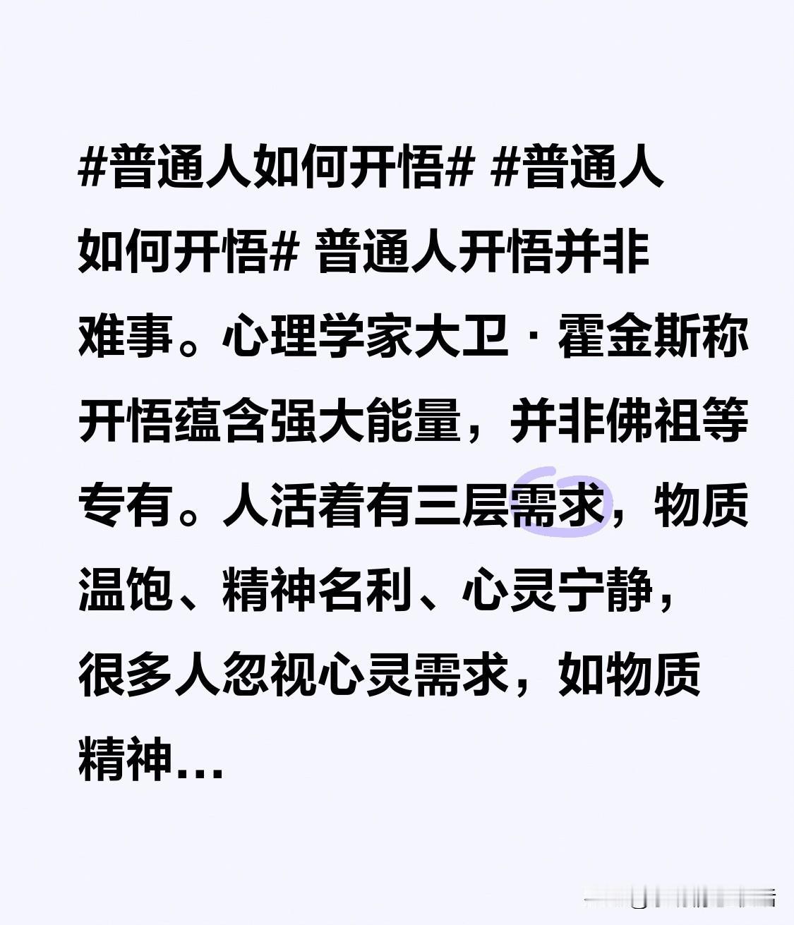 普通人开悟并非难事。心理学家大卫·霍金斯称开悟蕴含强大能量,并非佛祖等专有。人活着有三层需求,物质温饱、精神名利、心灵宁静,很多人忽视心灵需求,如物质精神富足的张国荣,因未滋养心灵走向极端。 开悟藏于七个“不”。不着急,似竹子扎根后拔节;不执着,放下执念心自在;不在乎,按己节奏生活;不用力,做事不钻牛角尖。读懂“不”,普通人也能生活开悟,日子通透。 低谷期开悟 开悟者的特点 开悟者的特征 中年开悟