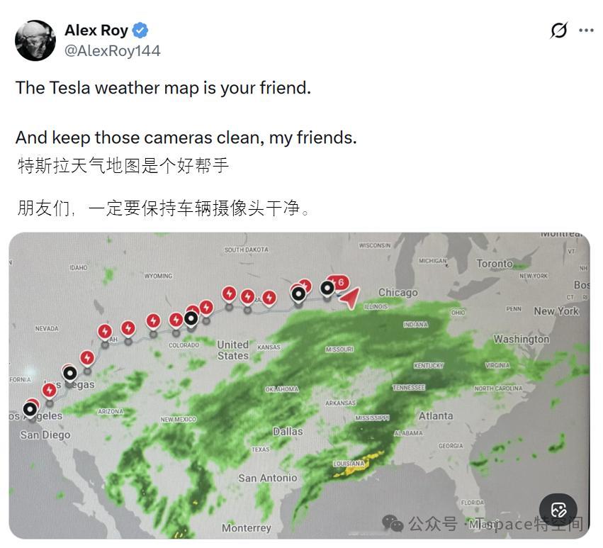 对于特斯拉安全稳定的行驶表现,车主特别点赞:特斯拉的“天气地图”功能非常友好,为行程规划提供了很多帮助。