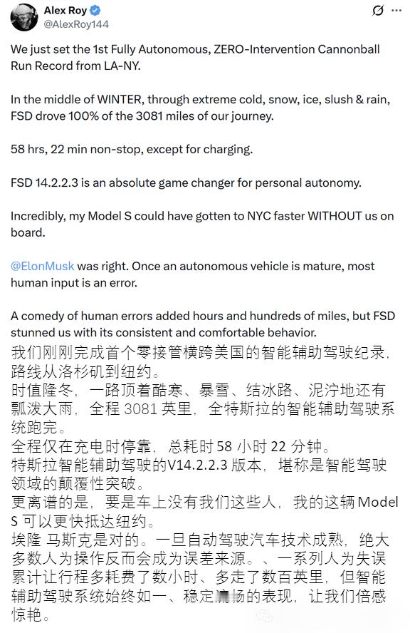 “倘若车内处于无人状态,理论上这趟行程耗时还能更短。面对特斯拉成熟的技术,人类的驾驶操作反倒成了误差来源。”