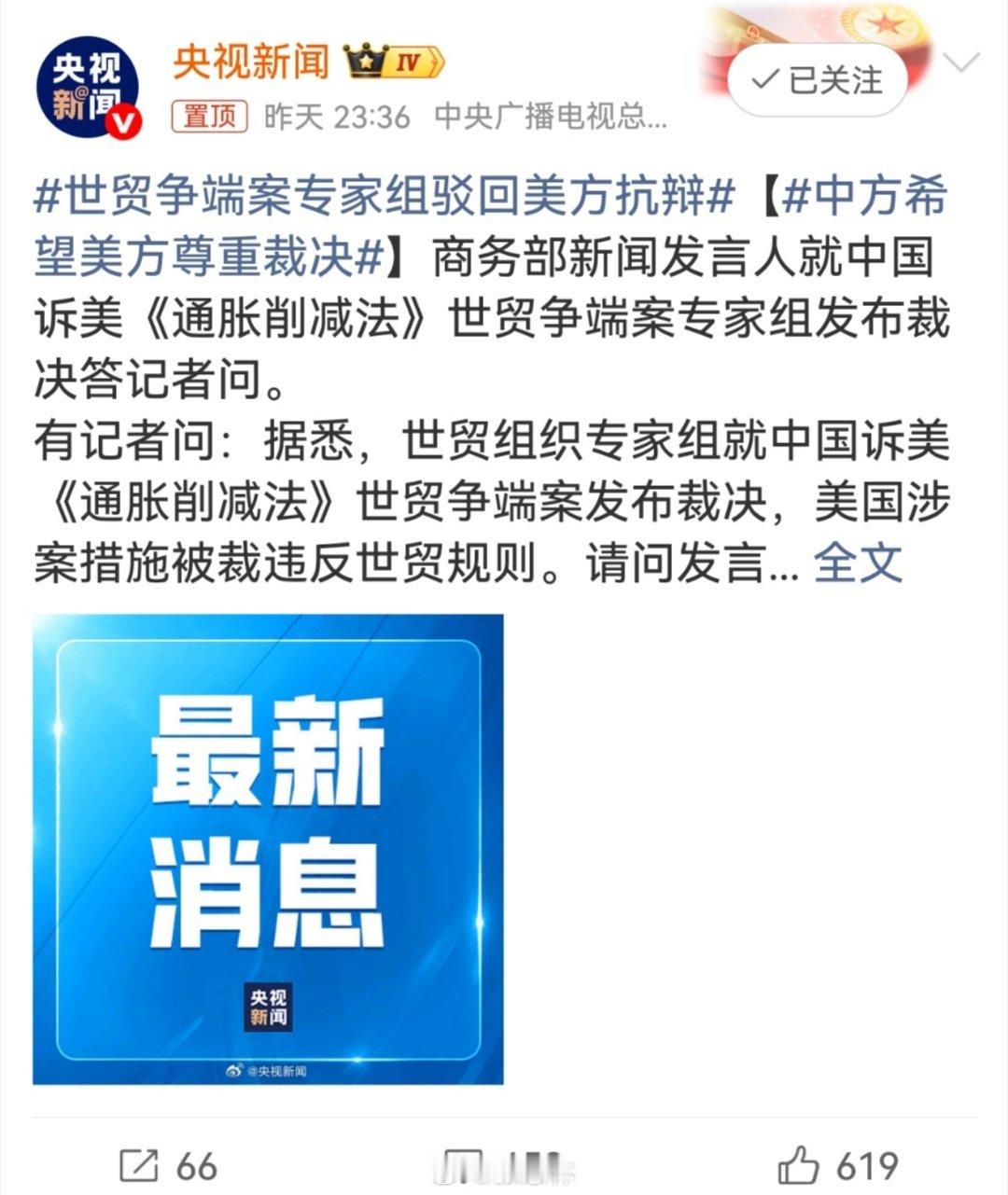 世贸争端案专家组驳回美方抗辩中方希望美方尊重裁决日内瓦当地时间1月30日,世贸组织公布中国诉美《通胀削减法》世贸争端案专家组裁决。专家组明确裁定,美方涉案清洁能源补贴措施违反世贸组织规则,驳回美方所谓涉案措施是为保护“公共道德”的抗辩,要求美方取消涉案补贴措施。中方对专家组作出的客观、公正裁决表示欢迎和赞赏。中方始终是世贸组织规则的坚定守护者、国际经贸秩序的坚定捍卫者,希望美方尊重专家组裁决,尊重世贸组织规则,尽快采取措施纠正错误做法,以实际行动维护国际经贸秩序,推动国际贸易稳定有序发展。