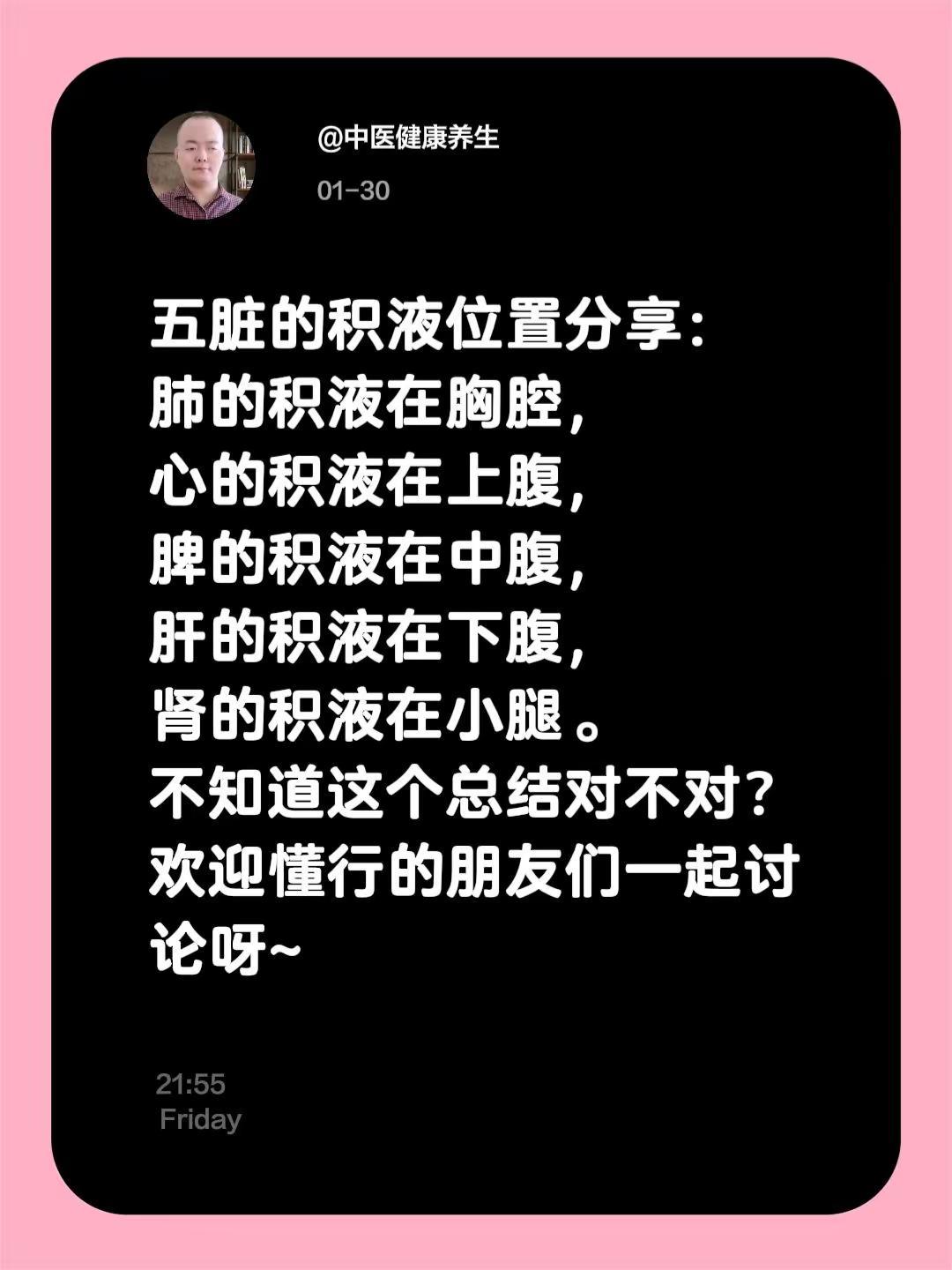 五脏的积液位置分享:肺的积液在胸腔,心的积液在上腹,脾的积液在中腹,肝的积液在下腹,肾的积液在小腿。不知道这个总结对不对?欢迎懂行的朋友们一起讨论呀~