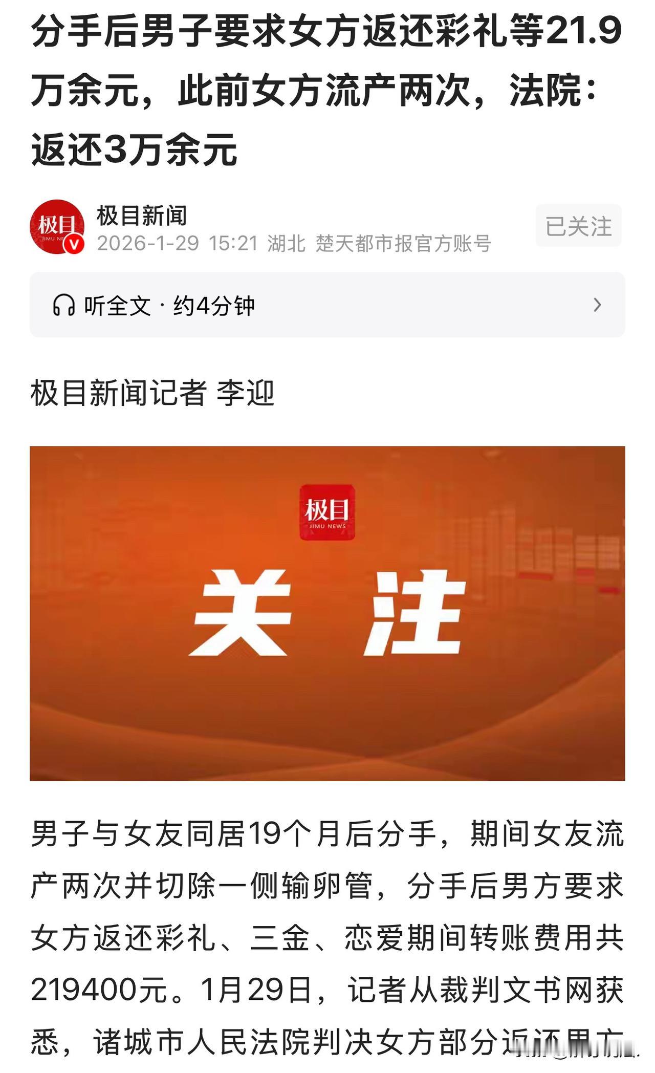 “妥妥的渣男!”山东诸城,女子经人介绍认识了男子,半个月后,二人迫不及待的捅破了那层窗户纸,在一起了。接下来的发展速度比火箭都快,先同居,接着办了婚宴,就是该办的没办,不知什么原因,迟迟没扯证。谁知,在同居期间,女子竟先后两次流产,导致女子切除了一侧输卵管。男子担心女子今后可能无法生育,果断提出分手,并要求女子返还彩礼等21.9万余元。女子认为自己的身体伤害都是男子造成的,这笔钱应该作为补偿,无需返还。男子不肯善罢甘休,直接将女子告上了法院,法院的判决很意外。 2022年8月1号,邵女士经人介绍认识了臧先生。 两人一见面就看对了眼,发展的速度比火箭都快。 半个月就迫不及待的发生了关系,随后,就直接搬到一起,开始同居生活。 相处大半年后,2023年5月1号,俩人没领证,却按照老家的规矩热热闹闹办了婚礼。 臧先生父母对邵女士也很看重,前后给了66000块彩礼,还买了不少黄金首饰,平时转账更是没断过,零零总总加起来有8万多。 臧先生还把一辆价值15000块的车过户到了邵女士名下。 这份诚意在旁人看来,真是奔着过一辈子去的。 可谁能想到,这份看似美满的感情,在2024年3月就彻底崩了,而且闹得鸡飞狗跳。 这一切的根源,得从邵女士的两次流产说起。 2023年2月,邵女士第一次怀孕后不幸流产,医生特意叮嘱,术后得好好休养,短期内绝对不能行房事。 可臧先生没把医嘱当回事,一个劲地要求,邵女士架不住软磨硬泡,最后还是没遵守医生的话。 没过多久,邵女士再次怀孕,本以为这次能顺利保住孩子,结果还是没能留住,更让人揪心的是,这次流产导致她右侧输卵管被切除了。 懂点常识的都知道,输卵管对女性有多重要,少了一侧,以后怀孕的几率会大大降低,这种身体伤害是一辈子都没法挽回的。 邵女士的父亲得知女儿遭了这么大罪,气得不行,多次找到臧先生,不仅动手家暴了他,还要求臧先生给女儿赔偿。 臧先生这边也觉得委屈又害怕,思来想去,干脆向邵女士提出了分手。 这一下可把邵女士彻底击垮了,身体受了重伤,感情又突然终结,换谁也扛不住。 可更让人没想到的是,分手后臧先生瞬间翻脸,直接列了一张清单,把当初给的彩礼、过户的汽车,甚至连俩人同居时的日常生活花销都算上了,总共21万多,要求邵女士全额返还。 邵女士没想到夕日的爱人竟翻脸无情,心一下就凉透了,坚决拒绝返还,自己身体受了这么大伤害,都是他造成的,没要赔偿就是便宜他了,还想要回彩礼,没门儿! 其实这事说到底挺让人唏嘘的,本来是奔着结婚去的两个人,最后闹到对簿公堂。 彩礼和财物是当初心甘情愿给的,可邵女士的身体伤害也是实实在在的。 《最高人民法院关于审理涉彩礼纠纷案件适用法律若干问题的规定》第6条规定,双方未办理结婚登记但已共同生活,男方请求返还按照习俗给付的彩礼的,人民法院应当根据彩礼实际使用及嫁妆情况,综合考虑共同生活及孕育情况、双方过错等事实,结合当地习俗,确定是否返还以及返还的具体比例。 具体到本案,没领证的情况下彩礼可能需要返还,但也要考虑共同生活情况、双方过错这些因素,尤其是邵女士有两次流产和器官切除的情况,法院会综合衡量。 最后,法院判决被告邵某清返还给原告臧某武彩礼款13200元,返还给戒指、手镯价款17384元,于本判决生效后十日内履行完毕;驳回原告的诉讼请求。