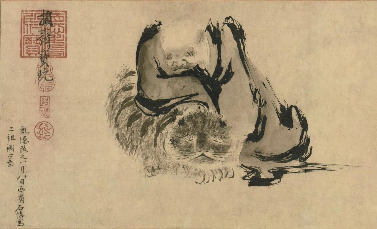 宋石恪二祖调心图,东京国立博物馆藏。交足神游者为禅宗二祖神光上人,与虎同卧者为天台僧丰干禅师。