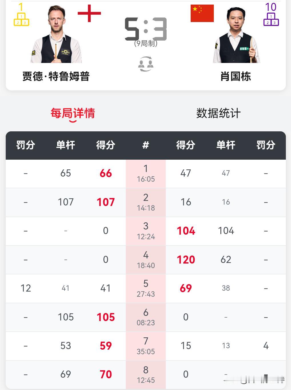 11连败,肖国栋出局,中国选手止步德国大师赛8强。 肖国栋对阵特鲁姆普,果冻表现