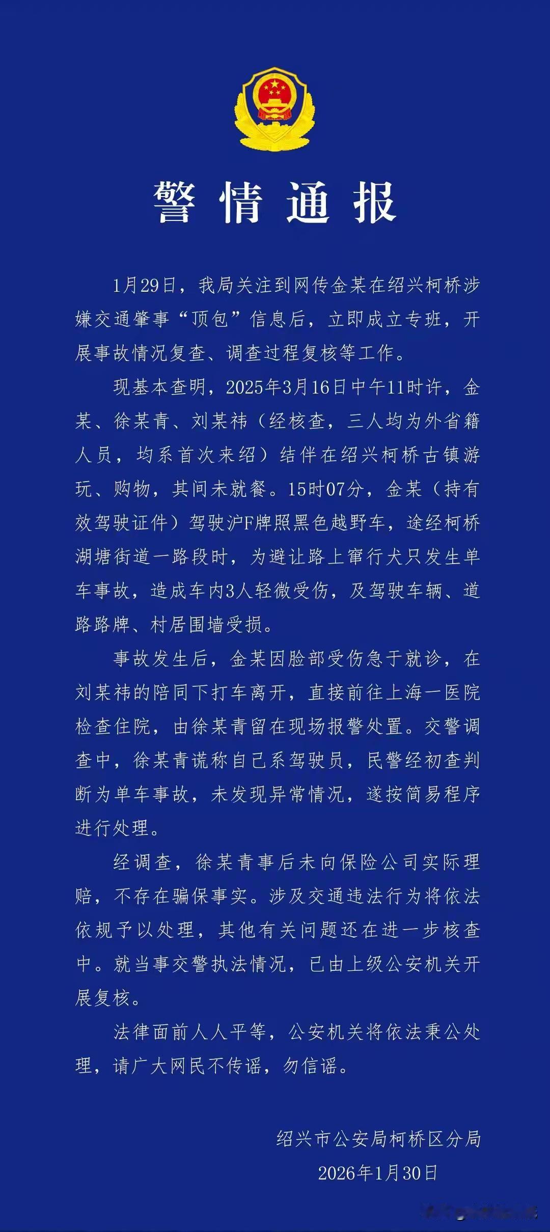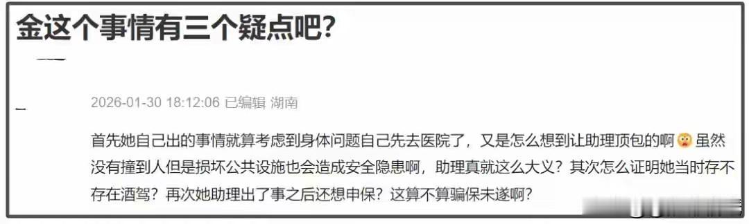 此事颇有蹊跷!官方通报已经发布,金晨也已出面致歉,网友似乎也都选择了相信。然而,一张满脸是血的图片,究竟是在博取公众同情,还是另有隐情?为何不发住院证明,而偏偏选择发布面部特写? 明明在交通事故后存在逃逸行为,还让助理顶包,却以“伤势较重”“需要手术”“急需就医”为由试图唤起同情。事后因助理办理理赔导致事件暴露,其中的曲折实在令人费解,这么做的动机目的到底为何?金晨 根据警方通报,事故原因是“为避让路上窜行的犬只发生单车事故,造成车内3人轻微受伤,以及车辆、路牌、围墙受损”。同时警方也称,“事故发生后,金某因脸部受伤急于就诊,在刘某祎陪同下打车离开,直接前往上海某医院检查住院”。 仅仅是轻微伤,何须特意从绍兴打车耗时近三小时前往上海的医院?事故发生后,当事人不仅未主动报警,甚至在知晓助理顶包后,也未第一时间向警方说明情况,直到近一年后公安交警通报后才出来声明。事情闹大了,撑不住了,不得不… 从这一系列做法,以及长达近一年的隐瞒来看,其对待法律的态度,已然清晰可见。公众人物,对待法律要有敬畏心。