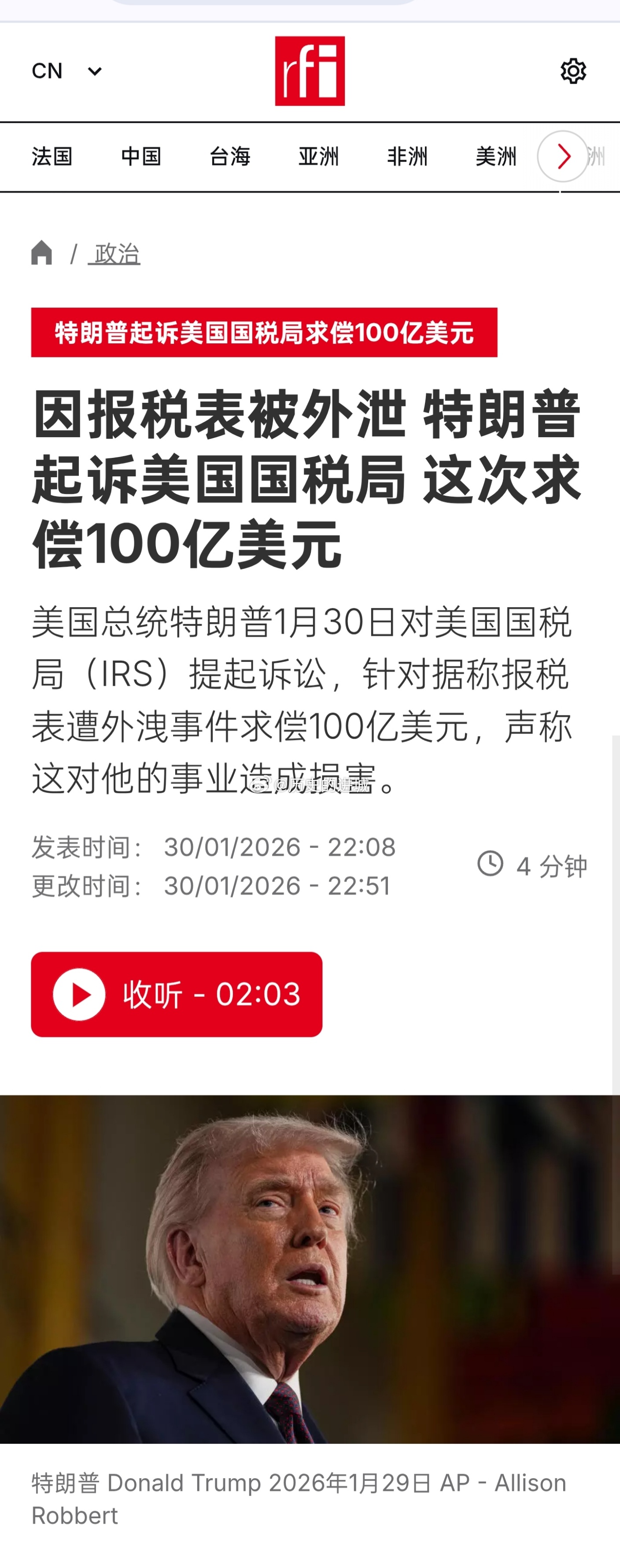 美国总统特朗普1月30日对美国国税局(IRS)提起诉讼,针对据称报税表遭外洩事件求偿100亿美元,声称这对他的事业造成损害。据报道,这起诉讼是由特朗普以个人身分与他的两个儿子艾里克和小唐纳以及家族企业“特朗普集团”共同提出。诉状指出,美国国税局与财政部“有责任维护与保护原告保密的纳税申报表”。