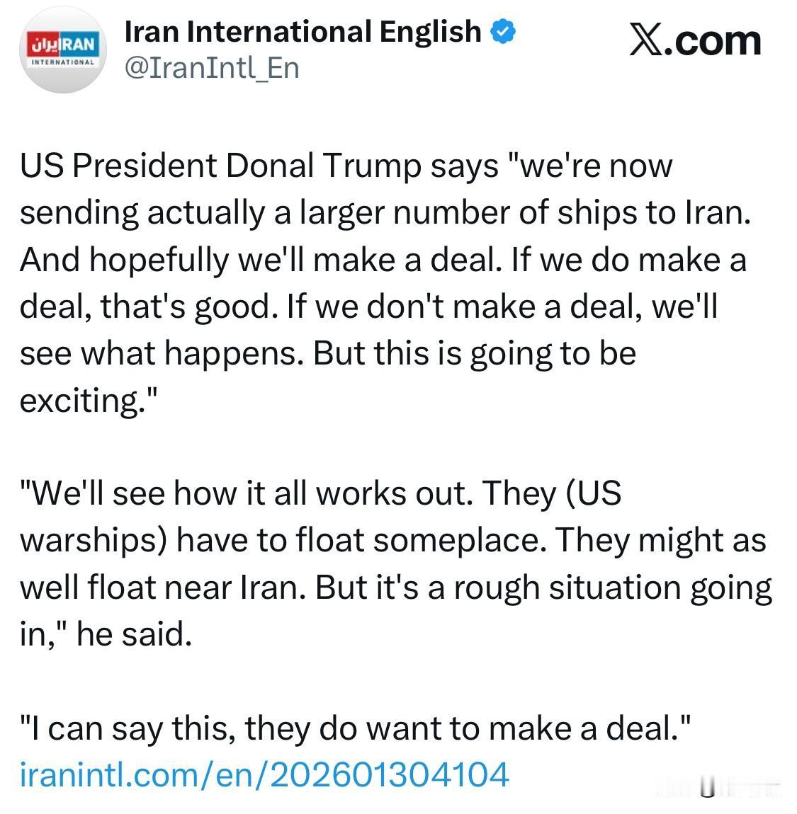 美国总统唐纳德·特朗普表示:“我们现在实际上正在向伊朗派遣更多舰船。希望我们能达成协议。如果达成协议,那很好。如果没达成协议,我们就看看会发生什么。但这将会很激动人心。” “我们拭目以待。他们(美国军舰)总得找个地方待着。他们或许可以待在伊朗附近。但目前的形势很艰难,”他说。 我可以这么说,他们确实想达成协议。