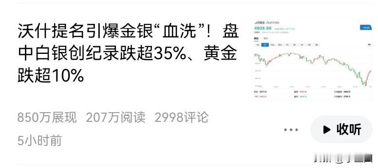 某人说:风险永远不会消失,它只会转移!盘中白银创纪录跌超35%、黄金跌超10%,谁才是韭菜? 看过一个举例,A欠B2000元,A没钱,只有一个黄金,值200元,不够还账。但是a掌控黄金调价,就先给黄金涨到2000,还给了B。钱还完后,a又把黄金调到200,又从b手中买回。 大家觉得这波该叫收割还是回调?[捂脸]
